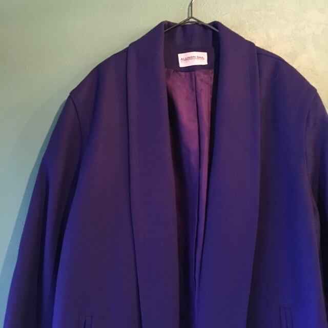 ■80~90年代頃のショールカラーウールコートです。鮮やかなパープルカラーがどことなく怪しさとカッコよさのあるアイテム。ショールカラーでボタンなしのざっくりと羽織れるシンプルなデザイン、外付けではなくスリットタイプのポケットも意外と計算されているところが◎USA製というところもポイントかと。