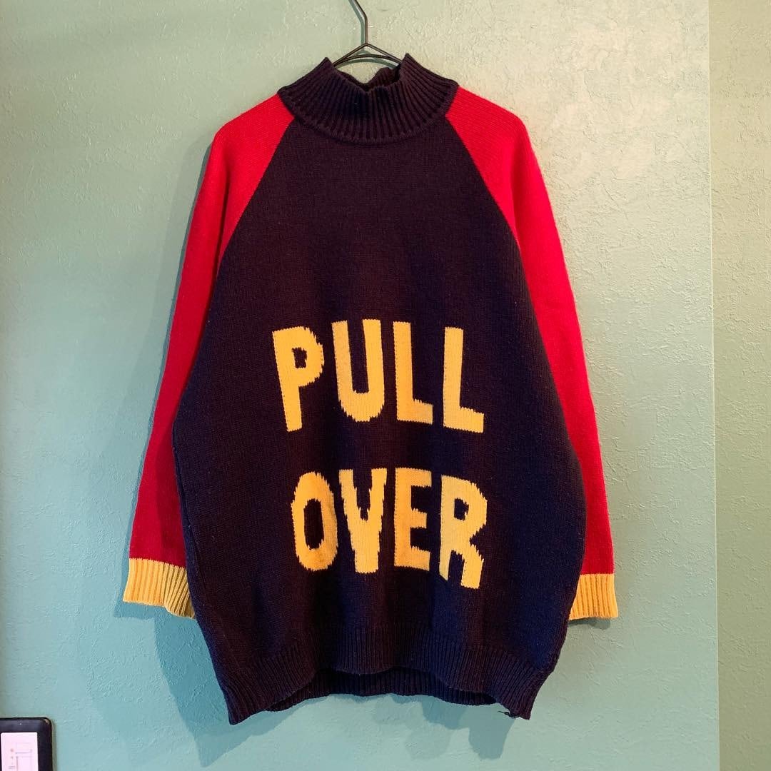 ■80~90年代のマルチカラーデザインニットです。レッド×ネイビー×イエローのおもちゃのようなマルチカラーリングに、『PULL OVER』と遊び心の利いたメッセージ。ラグランスリーブにハイネックデザインになっています。