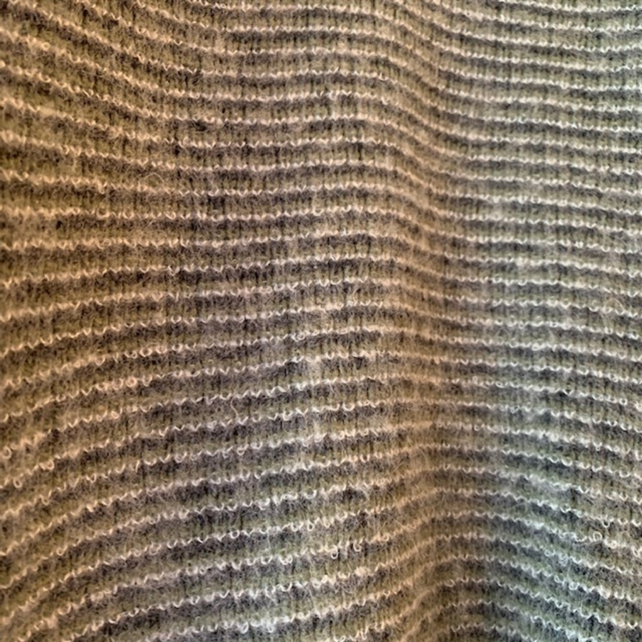 ■80年代のモヘアミックスボーダーニットです。ネイビー×カーキ×ホワイトの細ピッチボーダー。そこにフワフワしたモヘアが混ざっており、寒色のカラーリングですがどこか柔らかいイメージに。こちらもドロップショルダーのような肩が落ちるディテールとなっています。