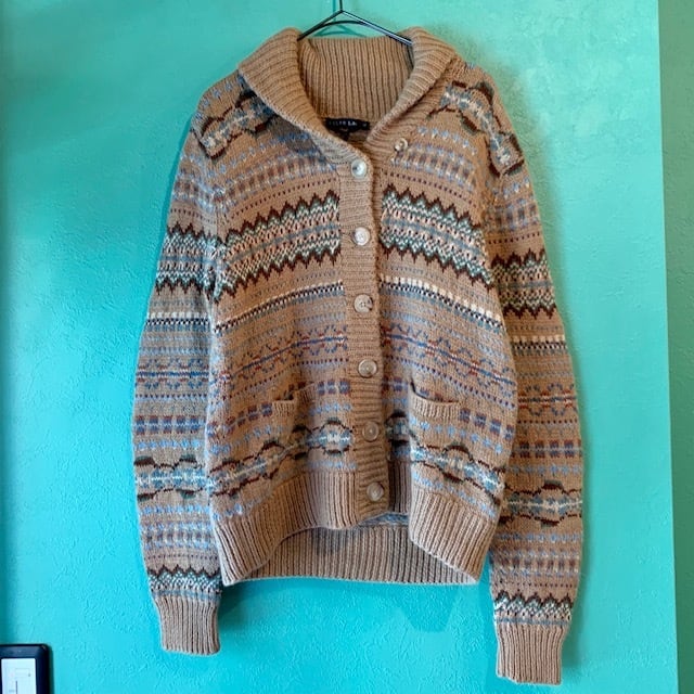 ■90~00年代頃のラルフローレンの総柄ショールカラーニットカーディガンです。ネイティブとノルディックの中間のようななんともいえない絶妙な柄。それもラルフらしいデザイン性かと思います。可愛くなり過ぎないミニマルなサイズ感とショールカラーデザインも計算されたいい塩梅なバランス感。歳を重ねても着たくなる一着かと。