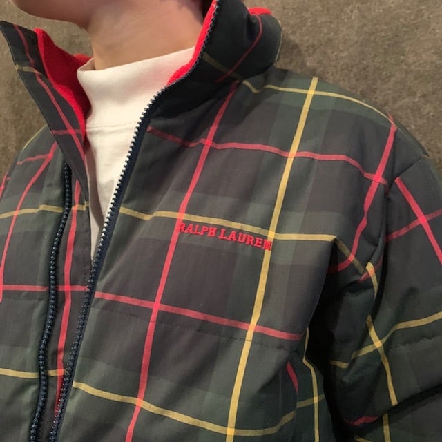 ■90年代頃のラルフローレンのダウンジャケットです。ラルフらしいタータンチェックパターン。おそらくユースサイズなので女性でジャストサイズです。ライニングもフリース地なので防寒性も完璧です。
