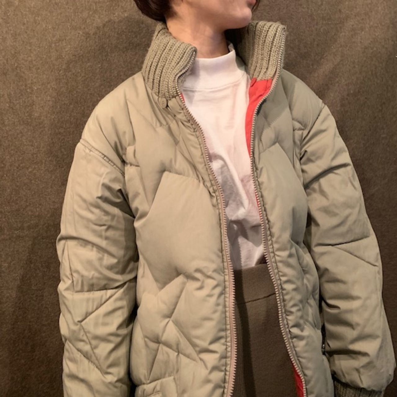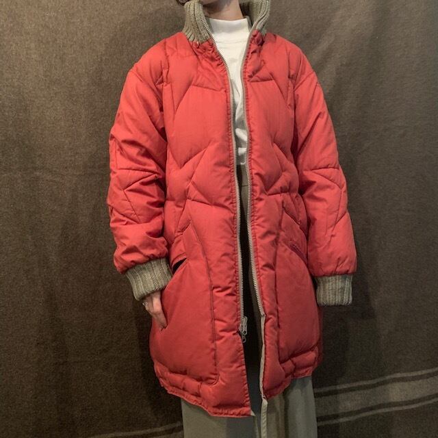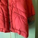 ■70~80年代頃のリバーシブルキルティングダウンコートです。よく見ると星柄になっているキルティングデザイン。オレンジと赤の中間色のA面とグレーカラーのB面になっており、どちらもメインとして使いやすい一着。ネックと袖にリブがあるので風も通しにくく、フェザーとダウン配合なので防寒性もバッチリです。