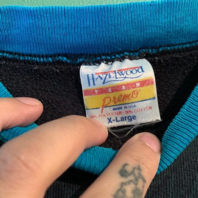 ■80~90年代頃の2とーんスエットです。水色とよく見ると柄?ロックプレートのようなパターンの2トーンとなっています。シンプルで使いやすいプレーンなアイテムですが普通過ぎないいい塩梅の一着かと思います。