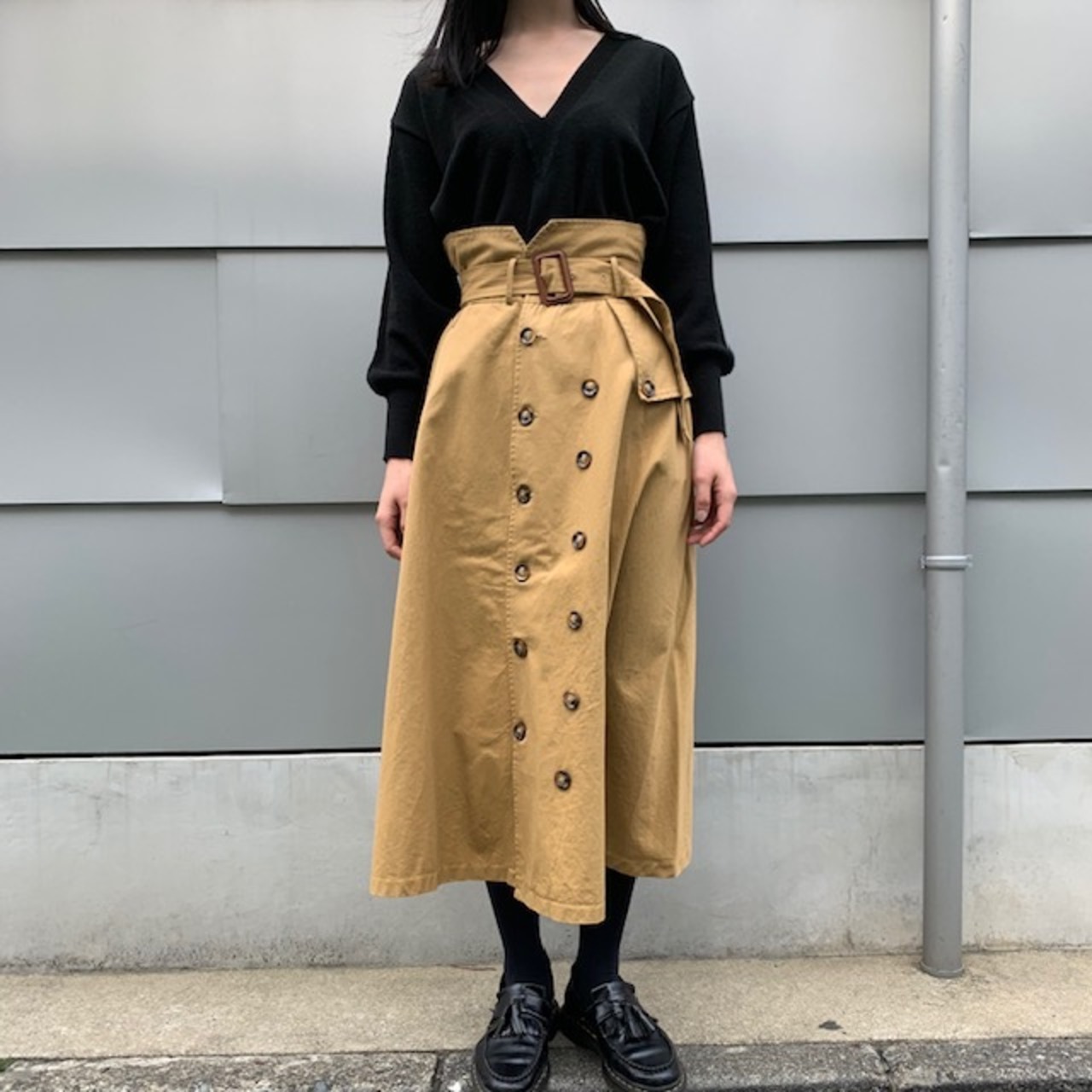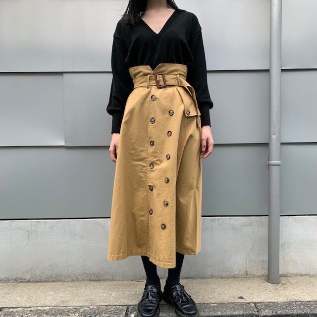■80~90年代頃のデザイントレンチスカートです。ありそうでなかった、まるでトレンチコートをスカートにした斬新なアイテム。ロング丈にウエストもベルトで調節できるフリーサイズ。キレイなAラインシルエットに動いた時のドレープ感も◎