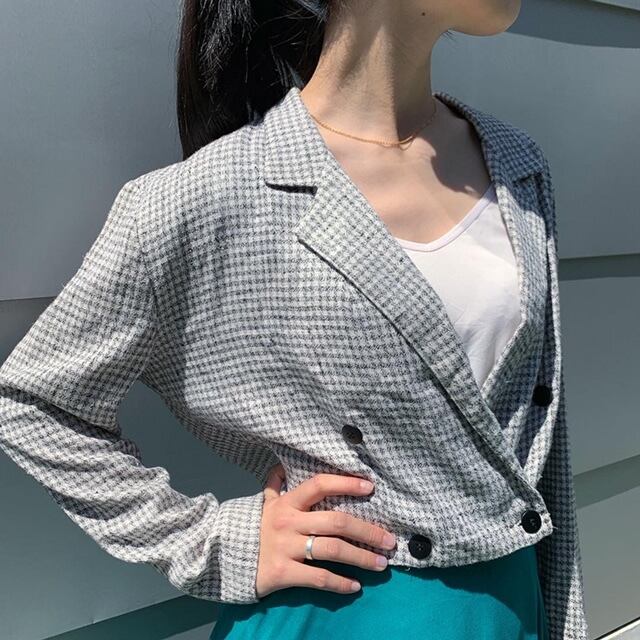 ■80年代のショート丈カスリチェックダブルブレストジャケットです。極端に短く設定されたクロップド丈にグレー×白のモノトーンベースのカスリチェック柄の可愛いジャケット。可愛くなり過ぎないようダブル仕立てで大人っぽい印象に。裏地もなく肩パットも入っていないアンコンジャケットなので春先や秋口にサラッと羽織れる一着かと思います。