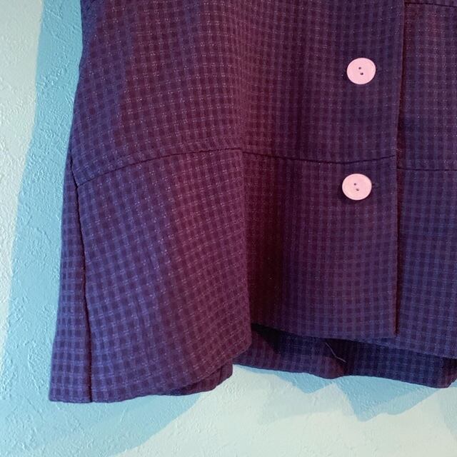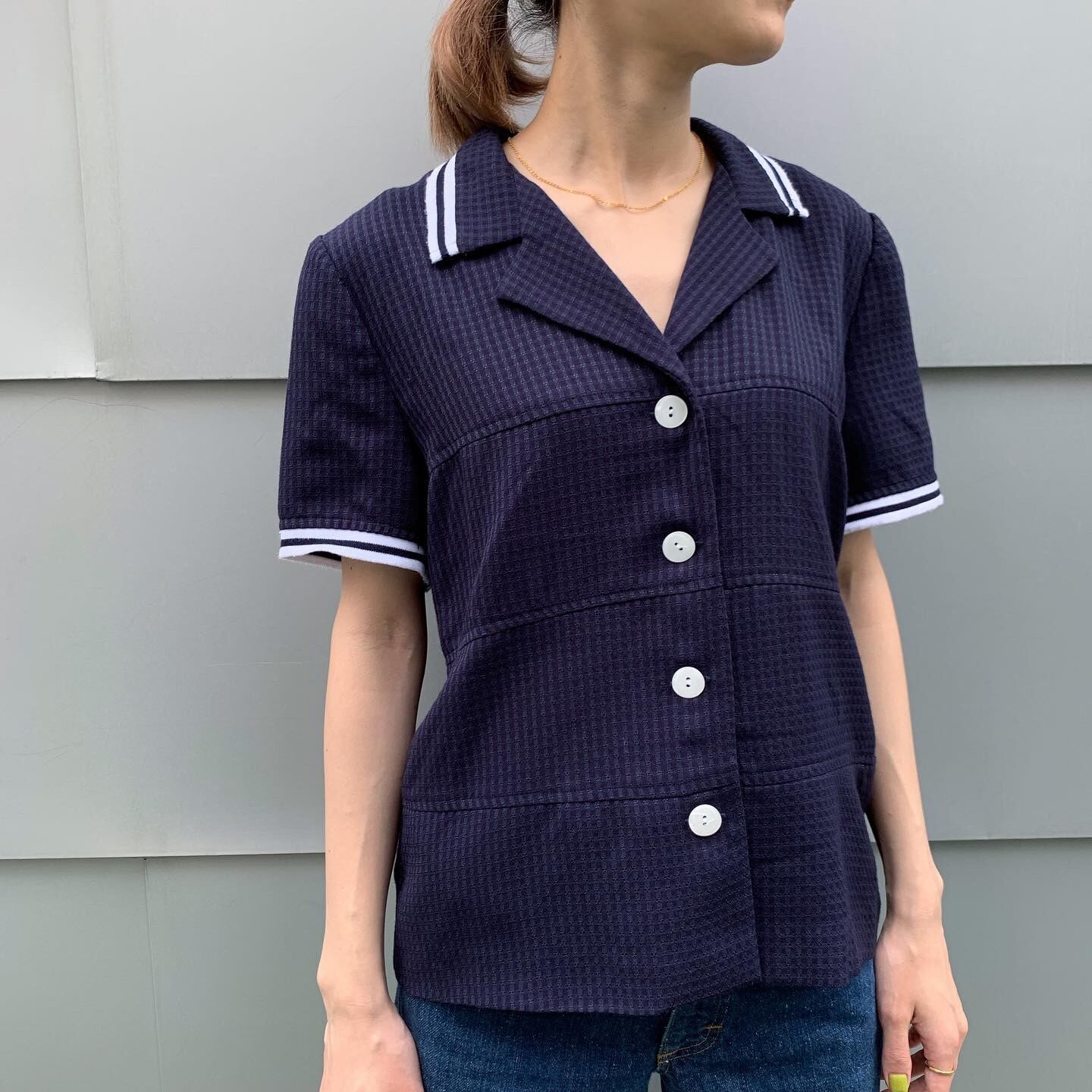 ■80年代のデザイン半袖シャツです。よく見るとネイビー×ブラックのチェックパターンになっており、襟と袖が白いパイピングでマリンテイストな一着。開襟でボックスシルエットと今っぽいシルエットになっております。