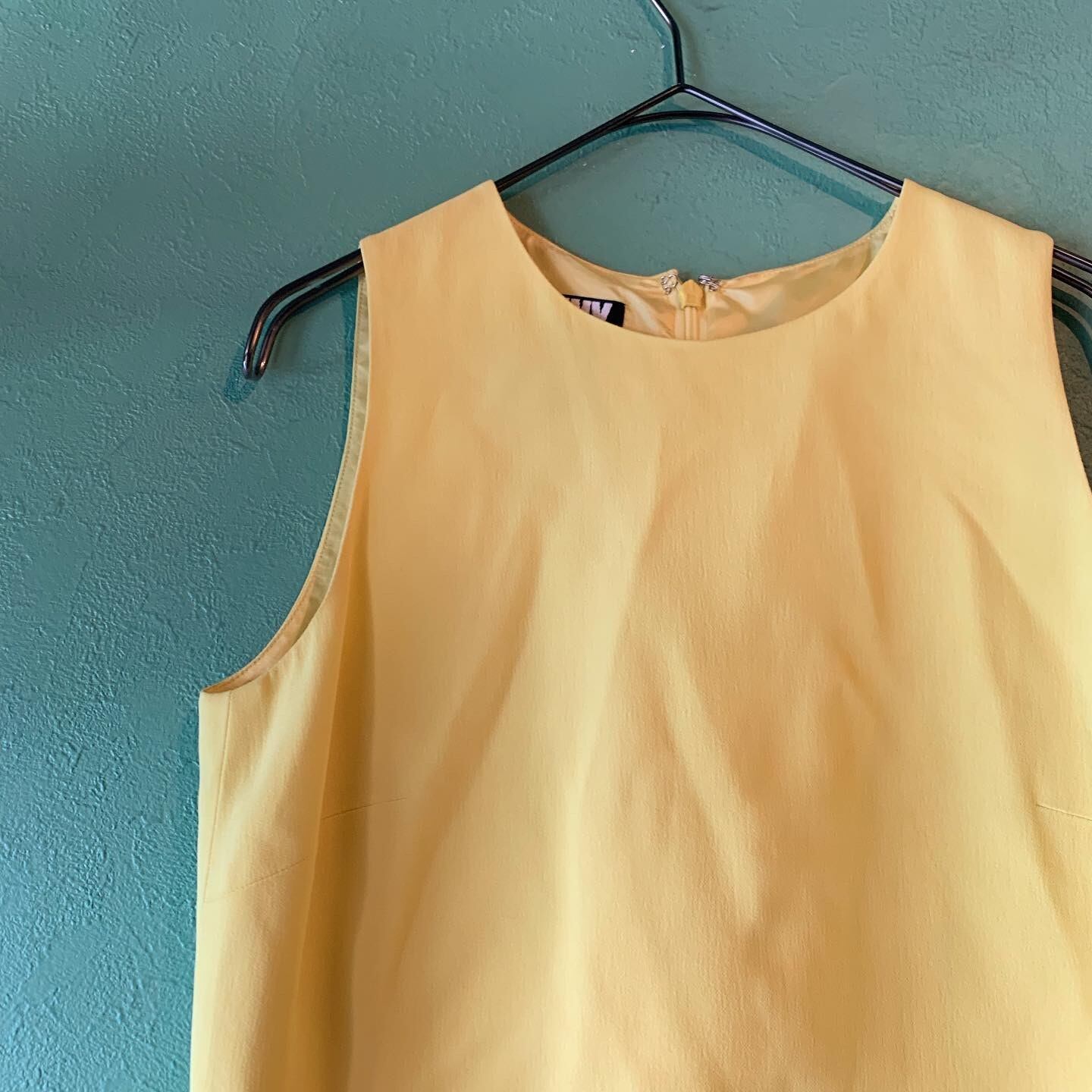 ■90年代頃のダナキャランニューヨークのノースリーブトップスです。鮮やかなイエローカラーが印象的な一着。サラッとした着心地に身幅ゆったりめのボックスシルエット。一枚でも様になるアイテムです。もちろんジャケットなどのインナーとしても使い勝手はいいかと思います。