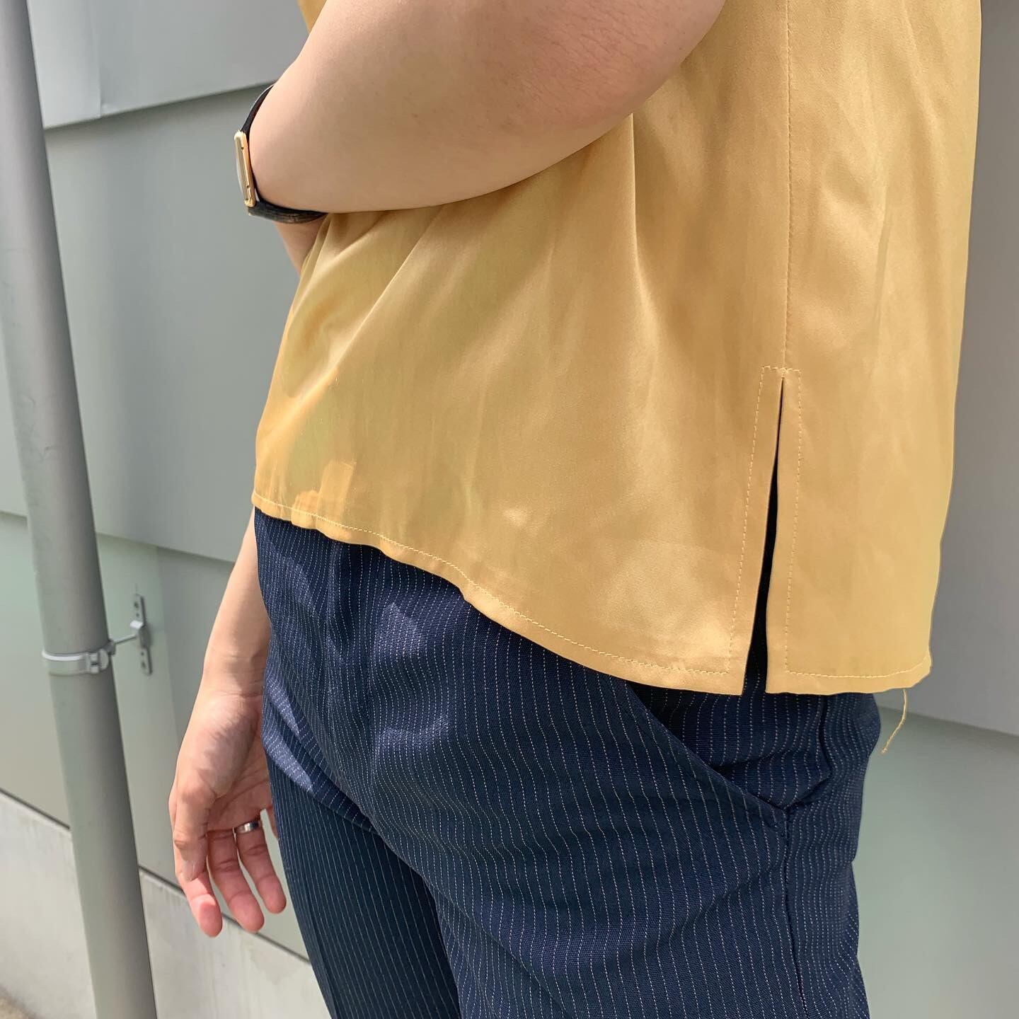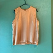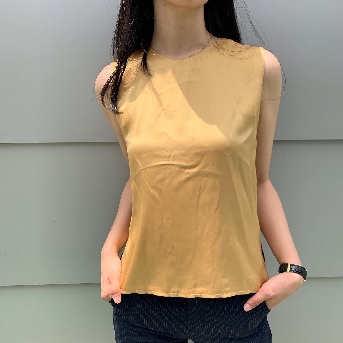 ■80~90年代頃のノースリーブトップスです。シンプルながらも一枚で様になるシャンパンゴールドのような色味のアイテム。身幅ゆったりめのボックスシルエットで裾にスリットの入った動きのあるデザインに。メインでももちろん、インナーとしても使える一着かと思います。