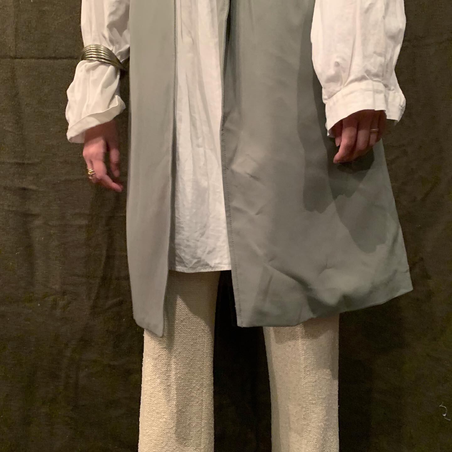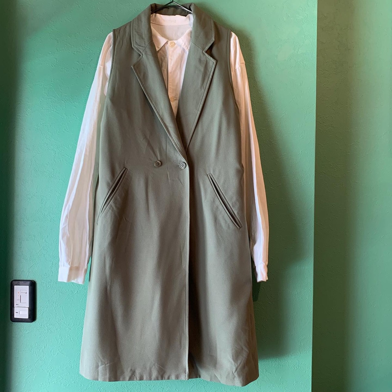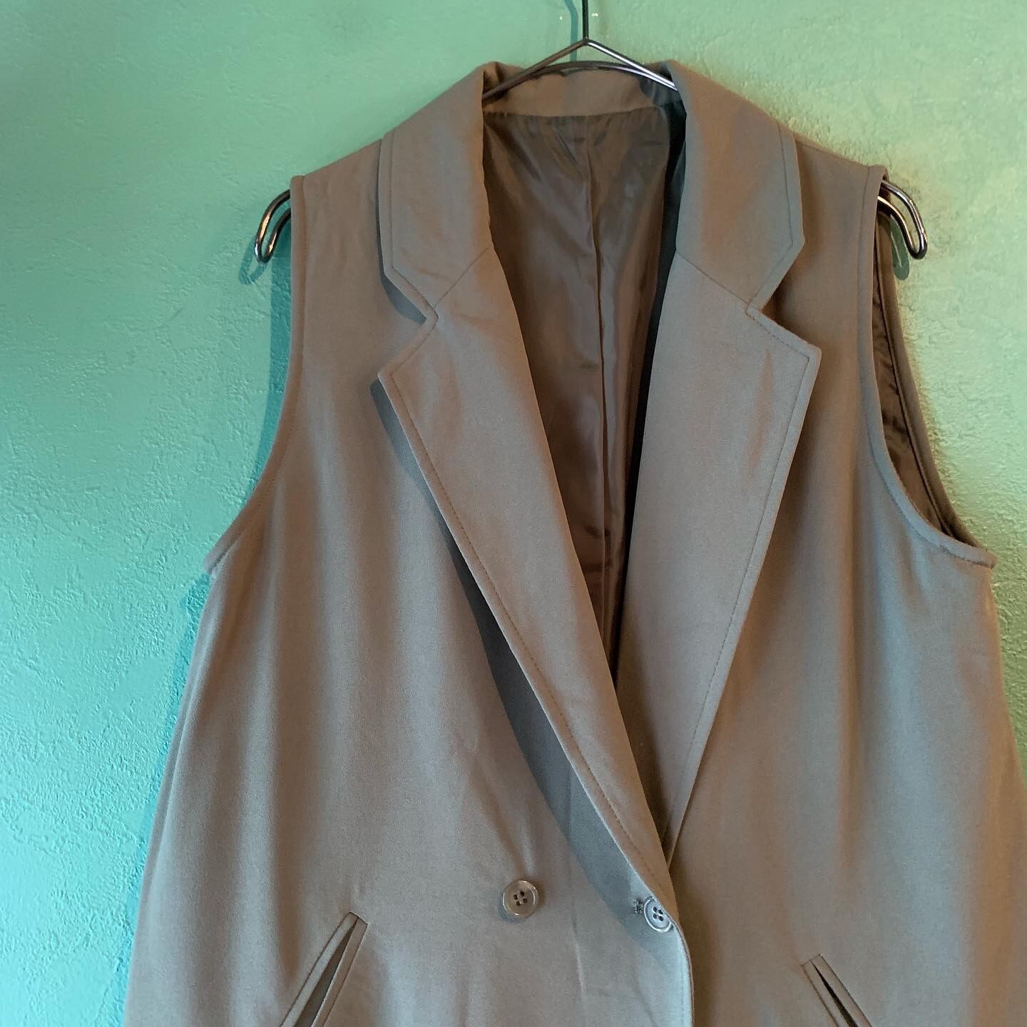 ■80~90年代頃のノースリーブデザインコートです。ダブルブレストのロング丈のベストのようなアイテム。カーキカラーのシンプルなディテールで合わせ方によってはオールシーズンで着れるアイテム。