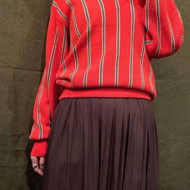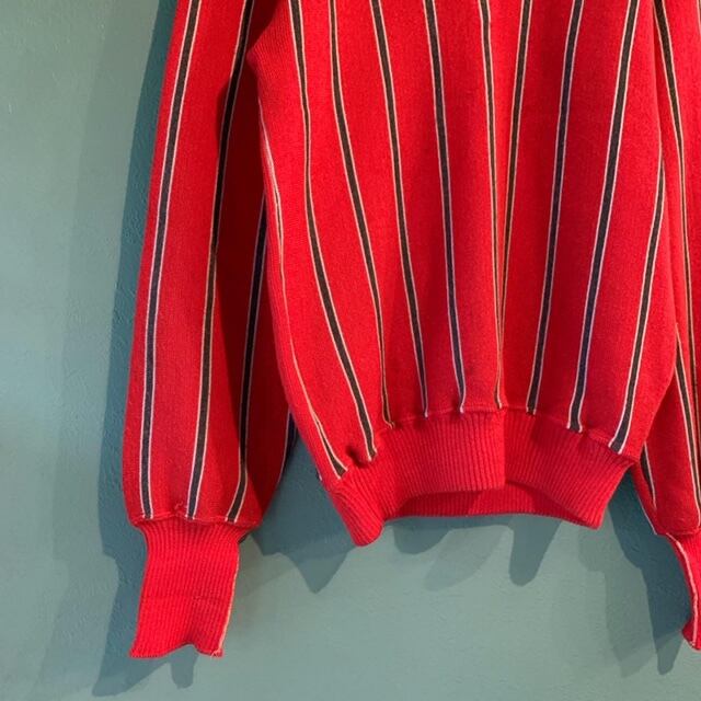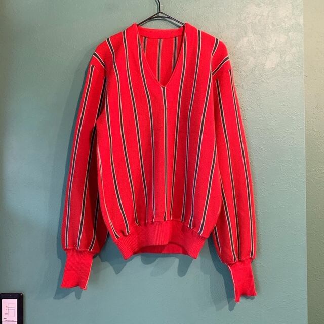 ■70年代のストライプVネックニットです。赤ベースにグレーのストライプ柄のオールドスクールな印象の一着。Vネックで少し大人っぽい印象に。カジュアルにもカチッとしたスタイルにもハマるアイテムかと思います。
