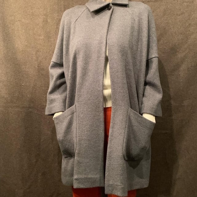 ■ジルサンダーのデザインウールコートです。シンプルなグレーカラーにやり過ぎてない遊び心のあるデザインコート。1ボタンのポンチョのようなディテールが可愛らしい一着。元々7分丈に設定された袖に肩の落ちるダウンショルダーシルエット。インナーを袖からチラつかせられるレイヤードも楽しめるアイテム。大判の外付けのポケットも良く、肩もストンとキレイに落ちるのでどんな体系の方でも着れます。