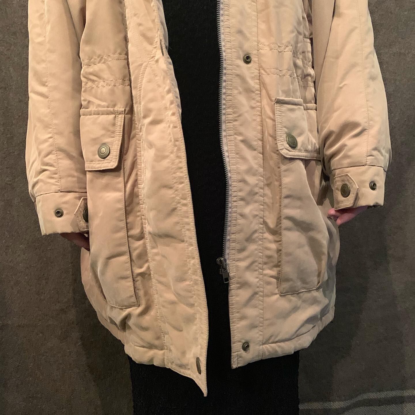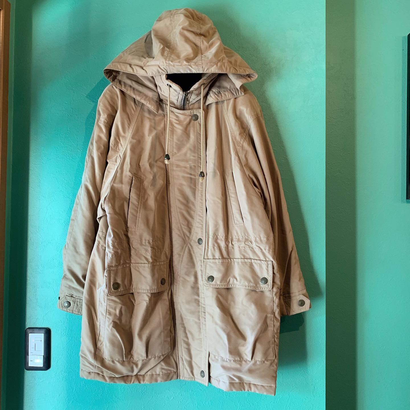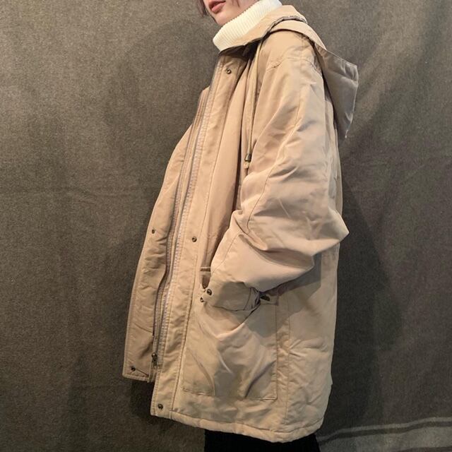 ■90年代頃の中綿入りデザインコートです。ベーシックに使い勝手の良いベージュカラーにマウンテンパーカーをコートにしたようなデザインのアイテム。表面はスムースコットンのようなしっとりとした触り心地の良い生地。中綿入りなので防寒性も◎ゆったりサイズなので中に着こむこともできます。