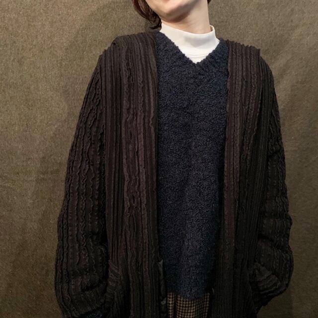 ■80年代頃のデザインフーディーロングコートです。まるでギャルソンやイッセイミヤケでもありそうなおもしろいアイテム。オールブラックカラーでありながらもウネウネの可愛らしいデザインがシンプルでありすぎないバランスの良い一着。ロング丈にフード付きという点でもあまり見かけません。