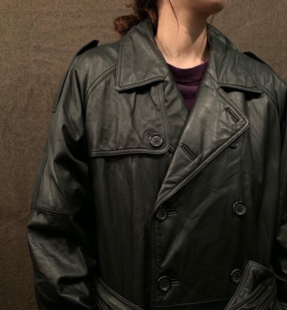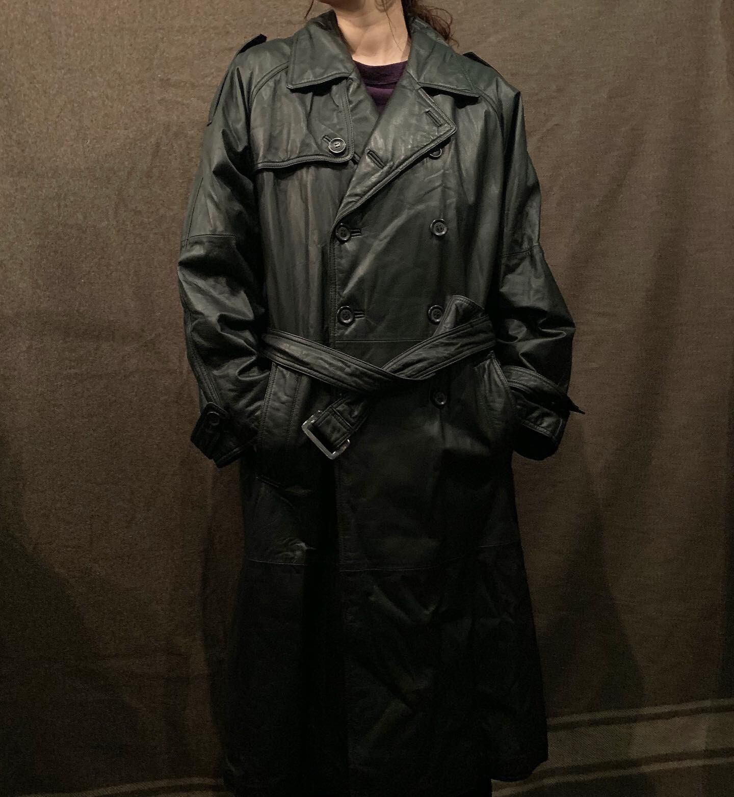 ■80~90年代のレザートレンチコートです。そのままトレンチコートのディテールにフェイクレザーを使用した一見ありそうでなかったかゆいところに手の届いたアイテム。どこかブランド物のような一着。あそらくメンズアイテムなのでもちろん男性が着ても、着用画像のように女性がゆったり着ても可愛いです。ラグランスリーブの為、どんな方でも違和感なく着用できます。