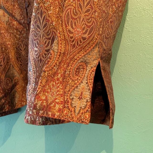 ■80~90年代のデザインシルクジャケットです。繊細な刺繍が施されたデザインジャケット。おそらくインドの服をモチーフとされたアイテムだと思われます。変わった襟のデザインとたくさんのボタンデザインが可愛らしいです。状態もほぼ未使用に近いグッドコンディションです。