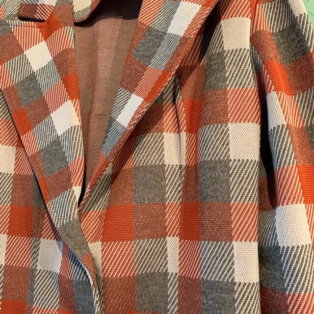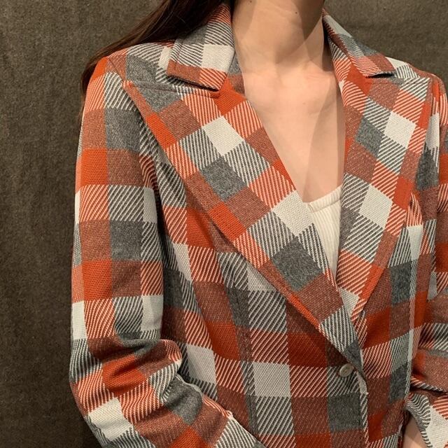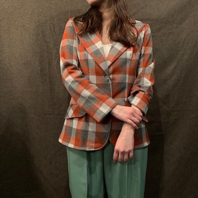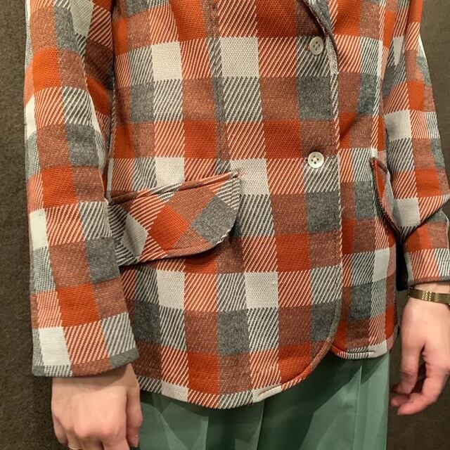 ■70年代のテーラードチェックジャケットです。ベーシックなテーラードジャケットのディテールですが、ダブルブレストでよく使用されるピークドラペルをあえてこのシングルで使用されているのが意外と珍しいです。オレンジがかったブラウンとホワイト、グレーのブロックチェックの配色も可愛らしいです。ヴィンテージ特有のハリ感のあるポリエステル地も◎