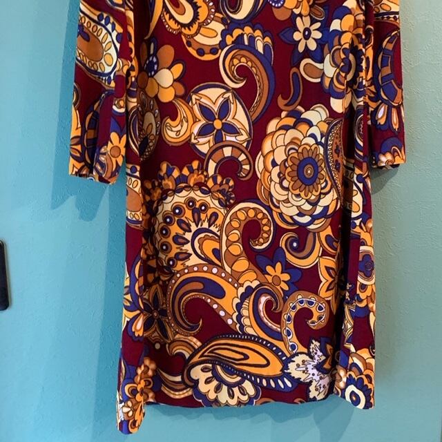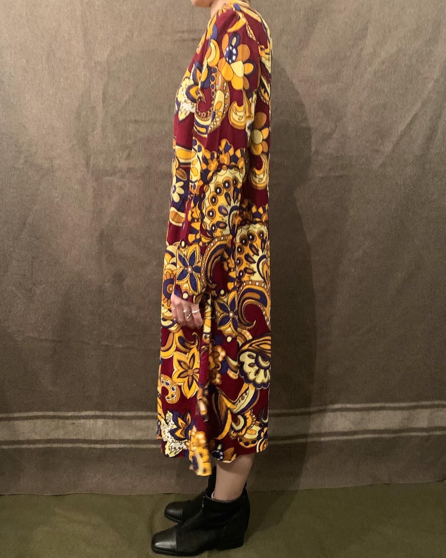ペイズリーのような独特な柄が可愛らしい一着。どこかGUCCIなどのハイブランドのようなパターンが良いです。ボートネック仕様でやや大人っぽい印象に。普段着でももちろん、パーティーなどにもいかがでしょうか。