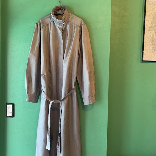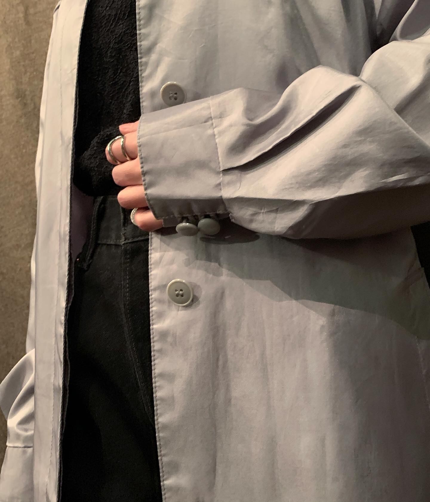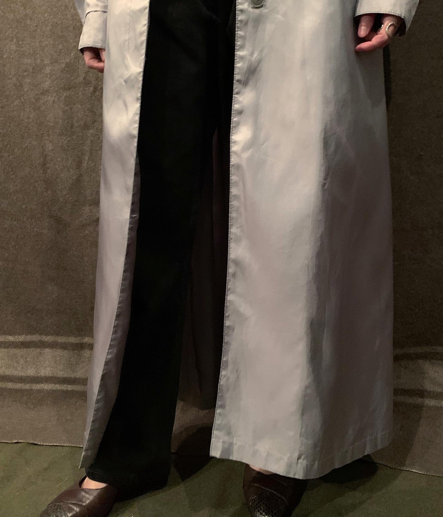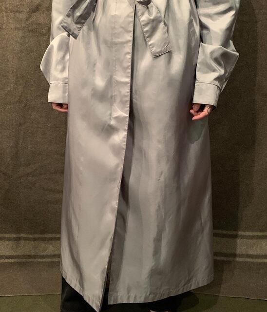 ■80年代のデザインコートです。メゾンブランドでありそうなメタリックシルバーカラーが印象的な一着。スタンドカラーにクルミボタンの仕様されたデザインネックにパフスリーブの袖が可愛いアイテム。生地も薄めでワンピースとしても着ることができます。