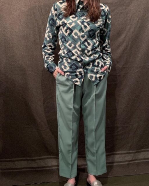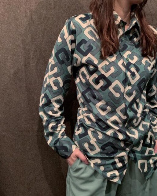 ■70年代頃の総柄ポリシャツです。70年代らしい地厚なポリエステル地に不思議な総柄パターン。どことなくグッチなどのハイブランドからでていそうな一着。インナーとしても存在感のあるアイテムです。