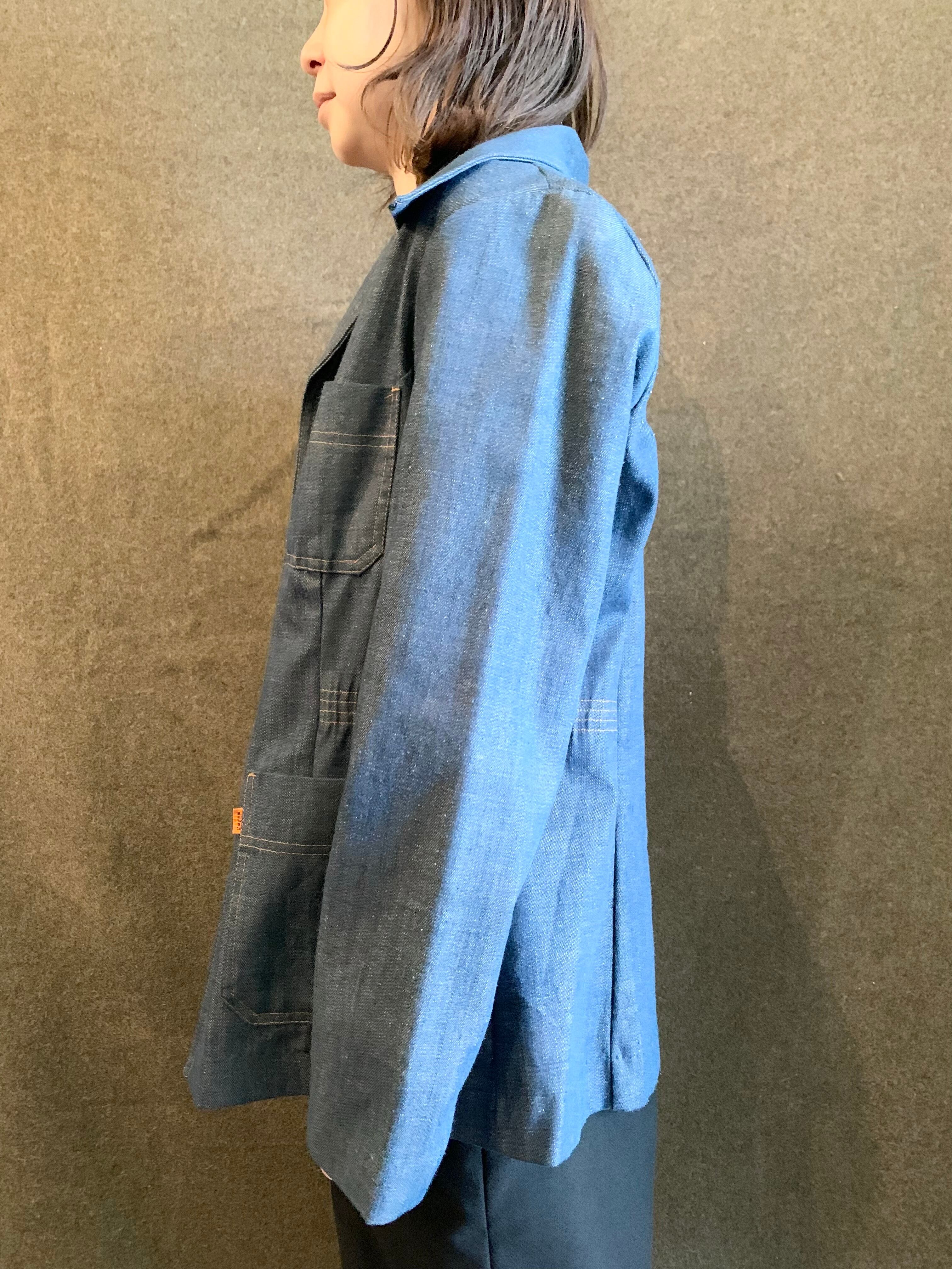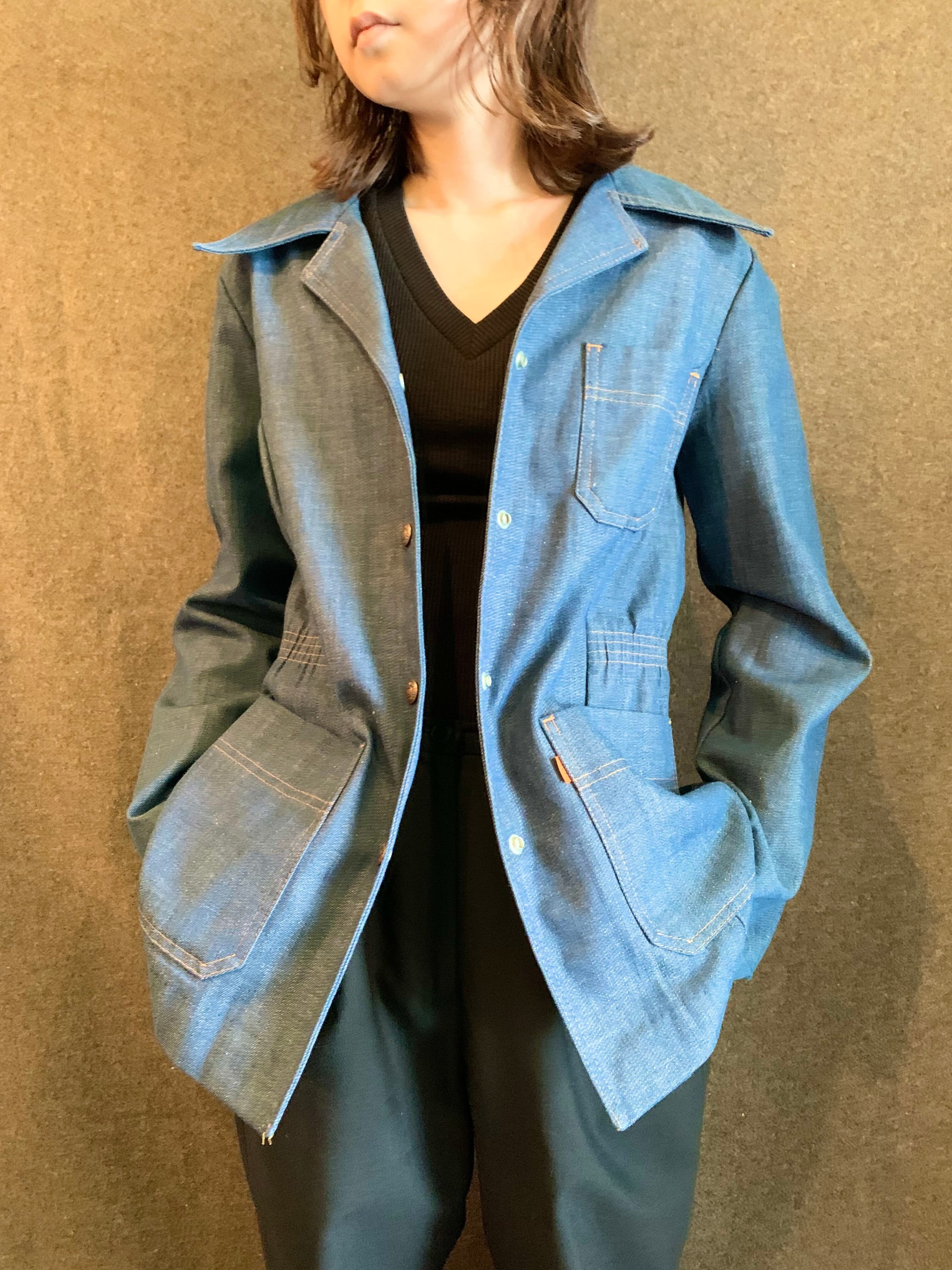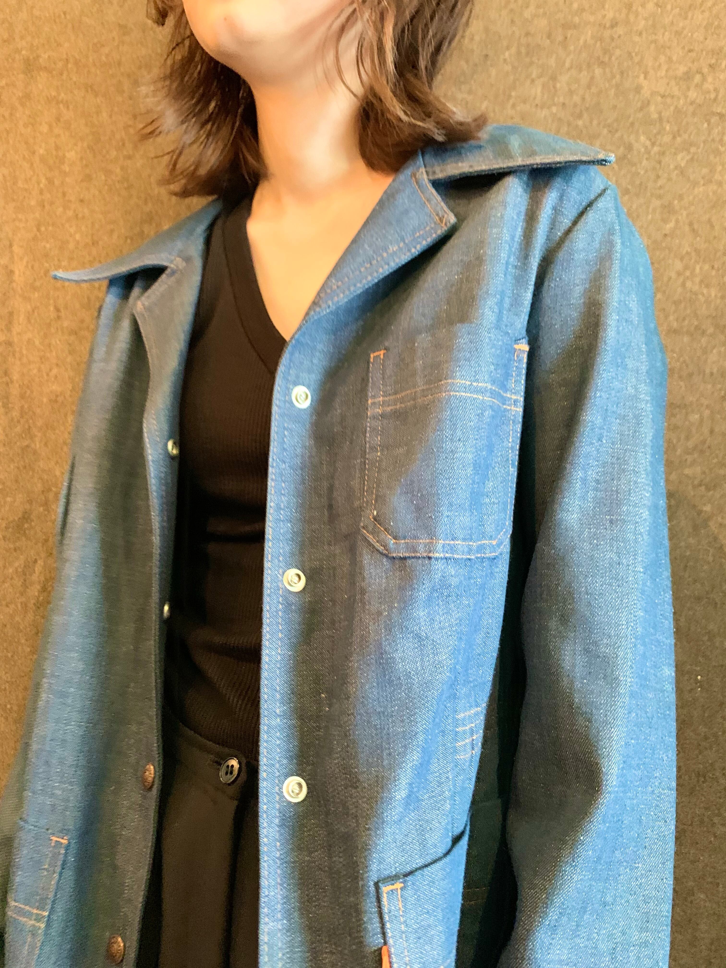 こちらは70年代特有の大ぶりのロングポイントの襟に開襟デザイン。3つポケットのジャケットディテールですがシャツのような生地の薄さです。スナップボタン使用で着脱も楽でウエスト部分が少し絞られた女性らしいシルエット。