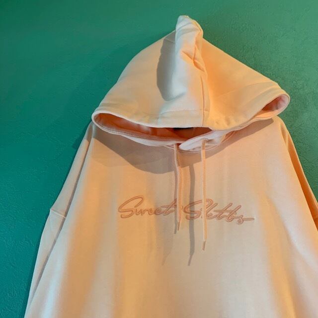 こちらは可愛らしいシャーベットカラーのピーチ。実際は淡いオレンジカラーに近いです。フロントにロゴ刺繍が施されたシンプルなデザイン。ルーズシルエットなので表記のサイズよりも大きめです。もちろん女性がゆったり着ても可愛いです。