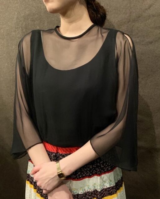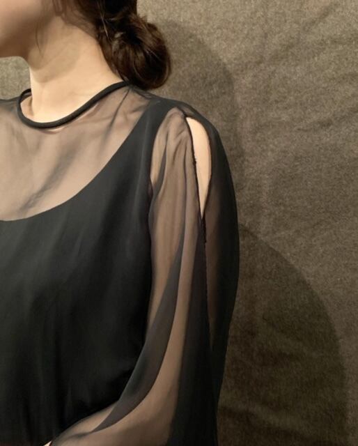 まるで上下別々のアイテムのよな変わったワンピース。トップス部分は透け感のあるシアーデザインに7分袖くらいのベルスリーブ。肩と袖にスリットが入っています。