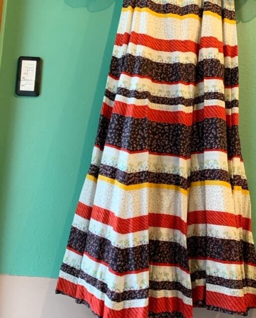 ボトムス部分は小花柄にAラインシルエットのスカートタイプ。ウエスト位置も高めに設定されており足が長く見えるディテールとなっています。こういった風変りなデザインでヴィンテージアイテムは珍しいかと思います。
