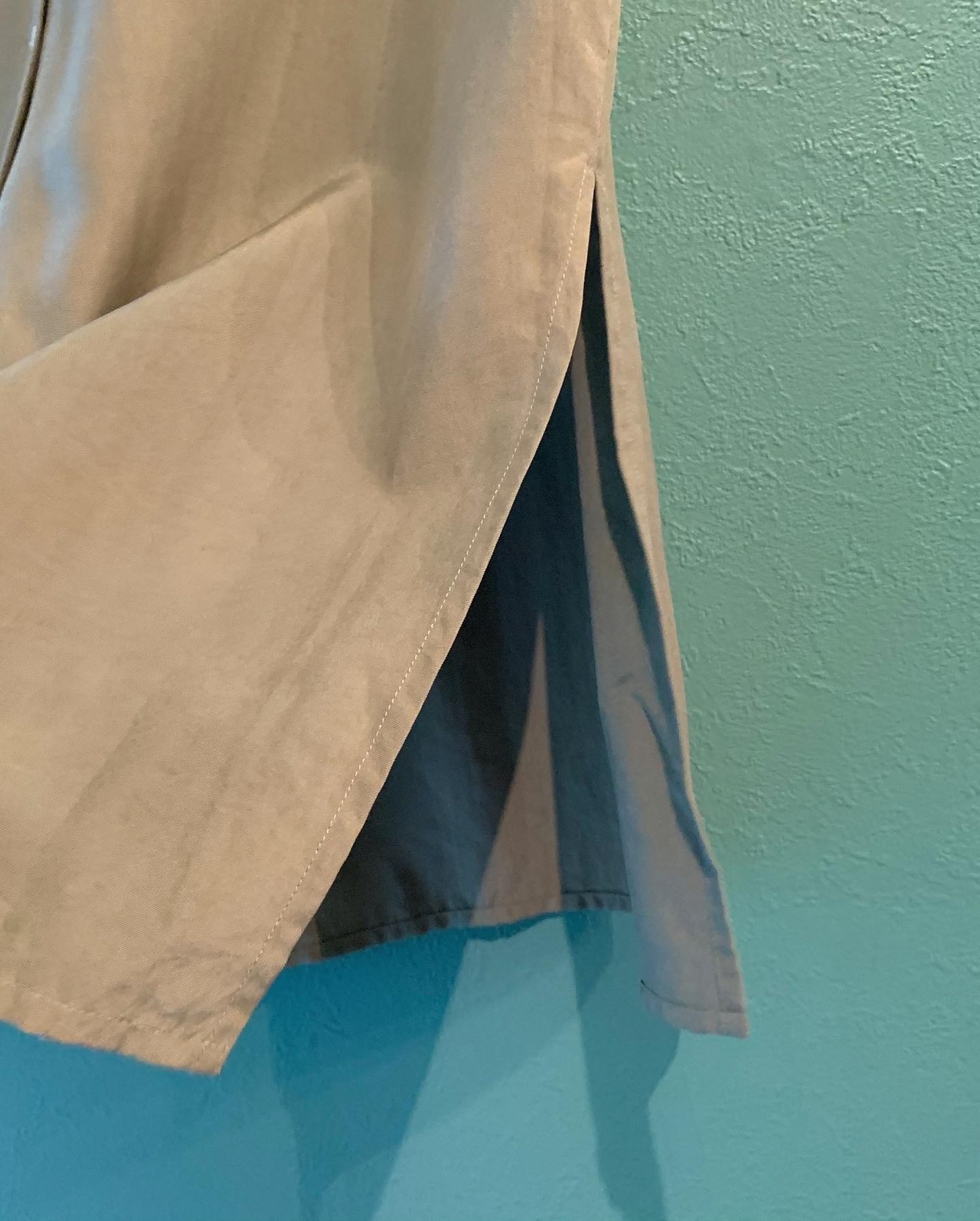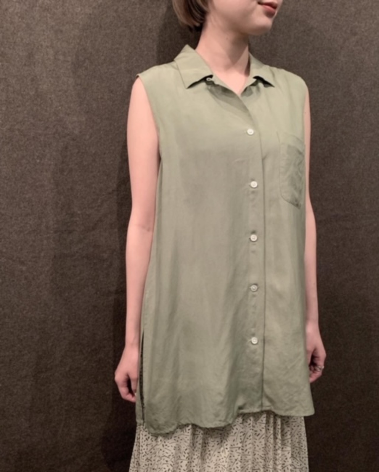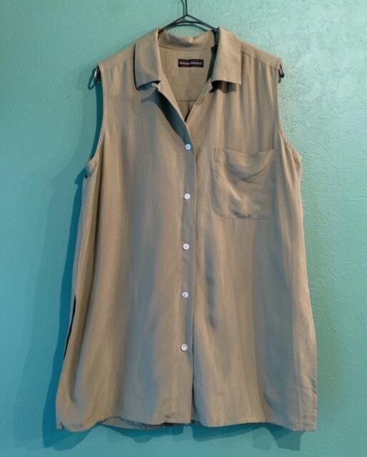 ループカラーの開襟仕様のシャツをノースリーブにしたアイテム。落ち着いたカーキカラーに着心地抜群なシルク素材。裾に深めのスリットが入っておりレイヤードも楽しめストンと落ちるキレイなシルエットになります。