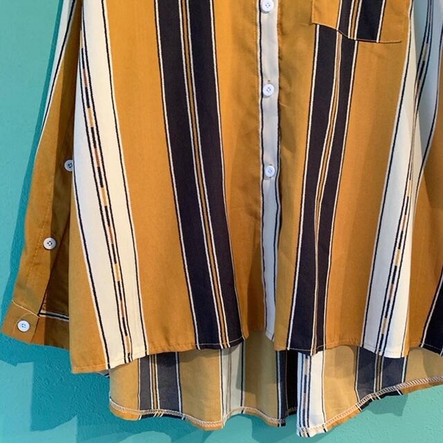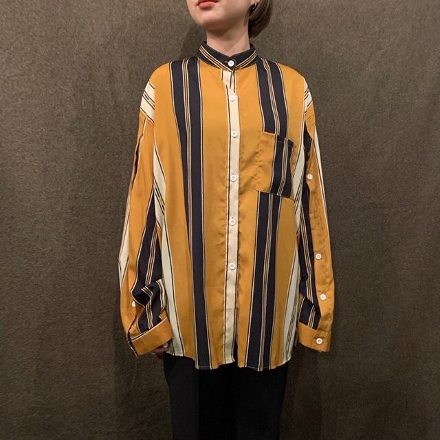 マスタードカラーをベースとした不規則なストライプパターンに襟なしのバンドカラーデザイン。身幅、袖ともにゆったりとしたシルエットに袖がボタンで開封できるデザインにもなっています。普通過ぎず攻めすぎていない為、カジュアルにもキレイめにも着れる良い塩梅のアイテムです。ルーズシルエットなので男性でも着ることができます。