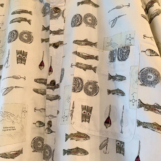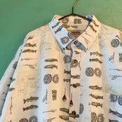 ルアーやフライの道具、ニジマスなどのトラウトフィッシングの総柄プリント。ボタンダウン仕様のシックなアイテムですが、元々メンズの大きめサイズを極端に丈の短く設定されたリサイズされた一着。身幅ゆったりめの作りにあえての短丈のバランス感を楽しんでいただければと思います。