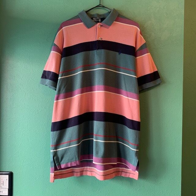 こちらは当店らしいピンク×グリーン×パープルをベースとしたポップなカラーリングのボーダーパターン。クラシックなアイテムですがこの配色に生地も鹿の子ではなくTシャツのようなサラッとした着心地のカジュアルなアイテム。しかもUSA製というのは嬉しいポイント。