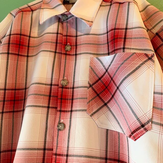 90年代感満載なチェックパターンにハリ感のある生地。ポリエステル、レーヨンなので着心地も抜群です。90sストリートなファッションにハマる一着かと思います。
