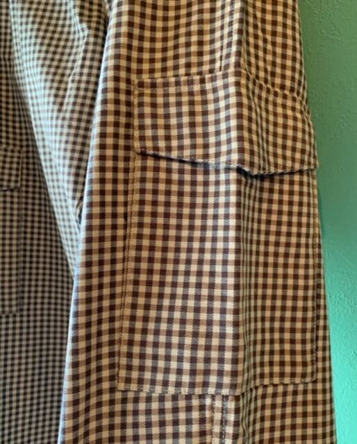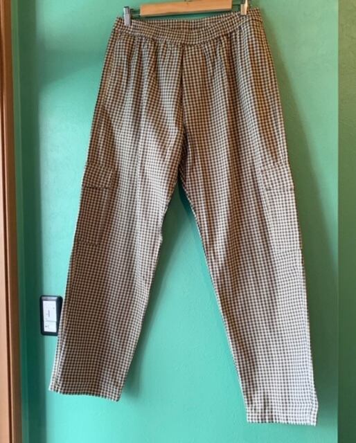 こちらはアクアスキュータムのようなシックなブラウン×ベージュのチェックパターンのパンツ。ウエストがゴムのイージー仕様でストレスフリーに履け、紐も付いているのでウエストも調節できます。6ポケットのカーゴパンツディテールで野暮ったさもありつつシックな配色のバランスが◎同シリーズのパンツとセットアップで着用いただけます。