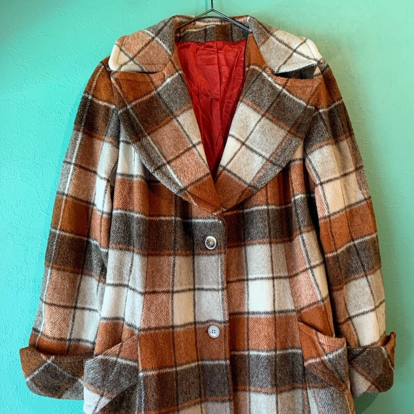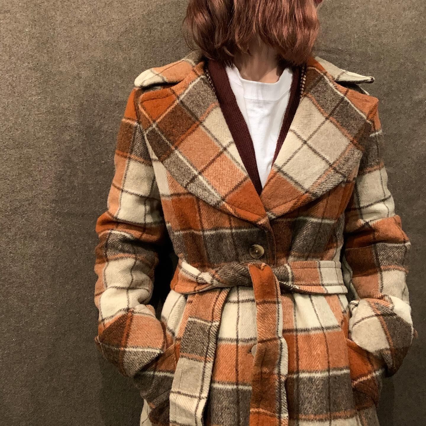 ブラウンとホワイトを基調とした可愛いらしいカラーリングのロングコート。70年代らしい大きいラペルのデザインも新鮮で、ウエストが少し絞られ裾にドレープの効いた女性らしいシルエットも完璧です。