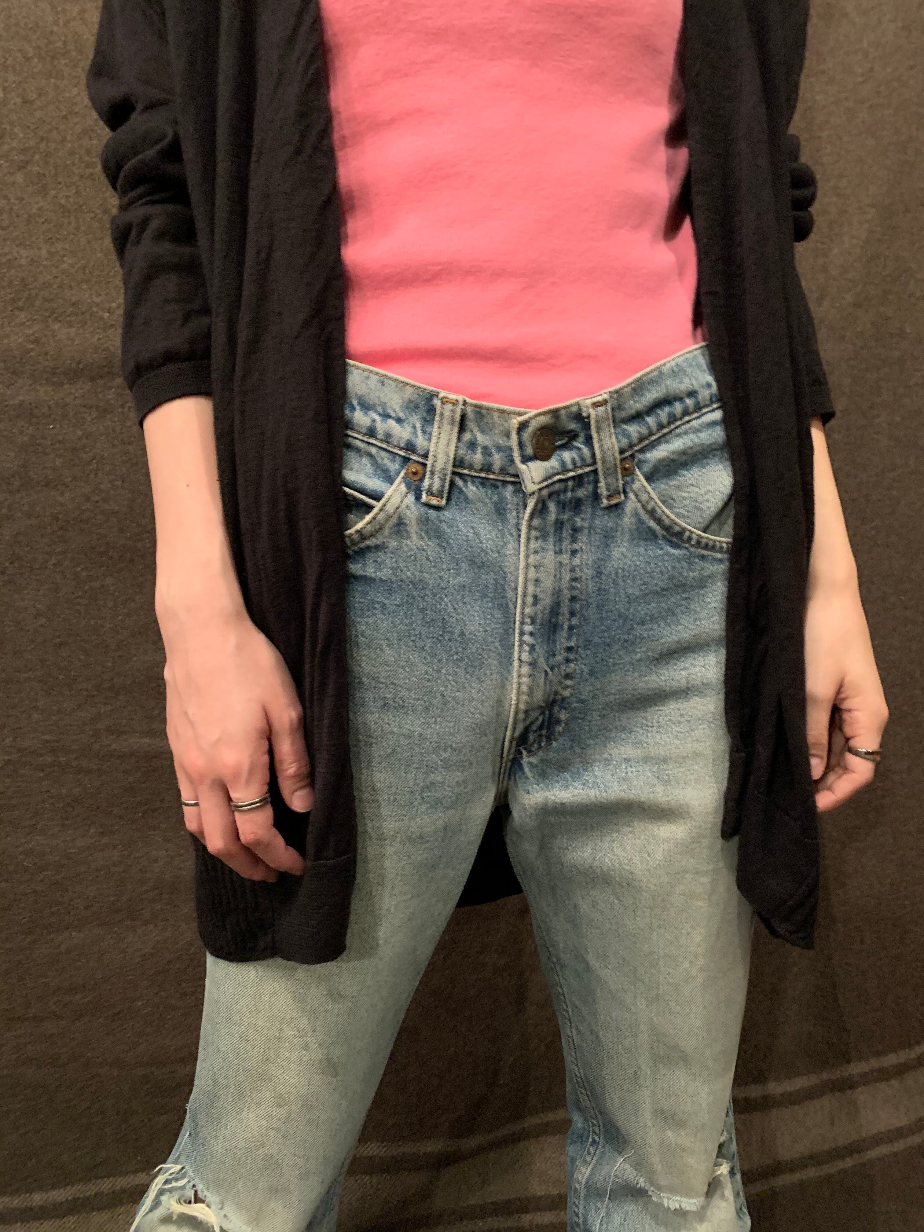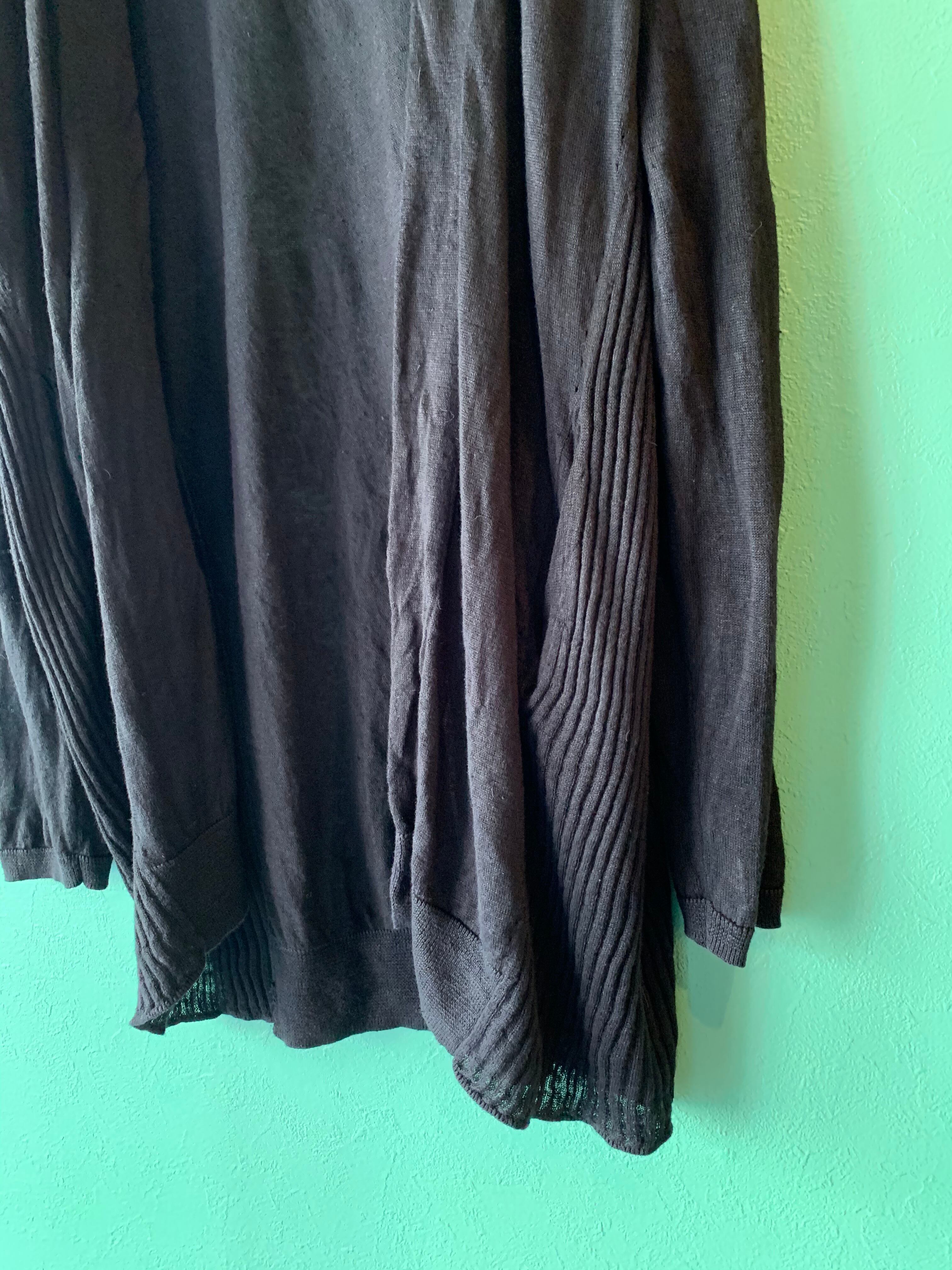 ロング丈にボタンレスの羽織のようなデザイン。両サイドがリブになっておりロング丈でも野暮ったく見えず、ハイゲージ編みで薄手なのでインナーとしても使いやすいです。