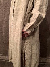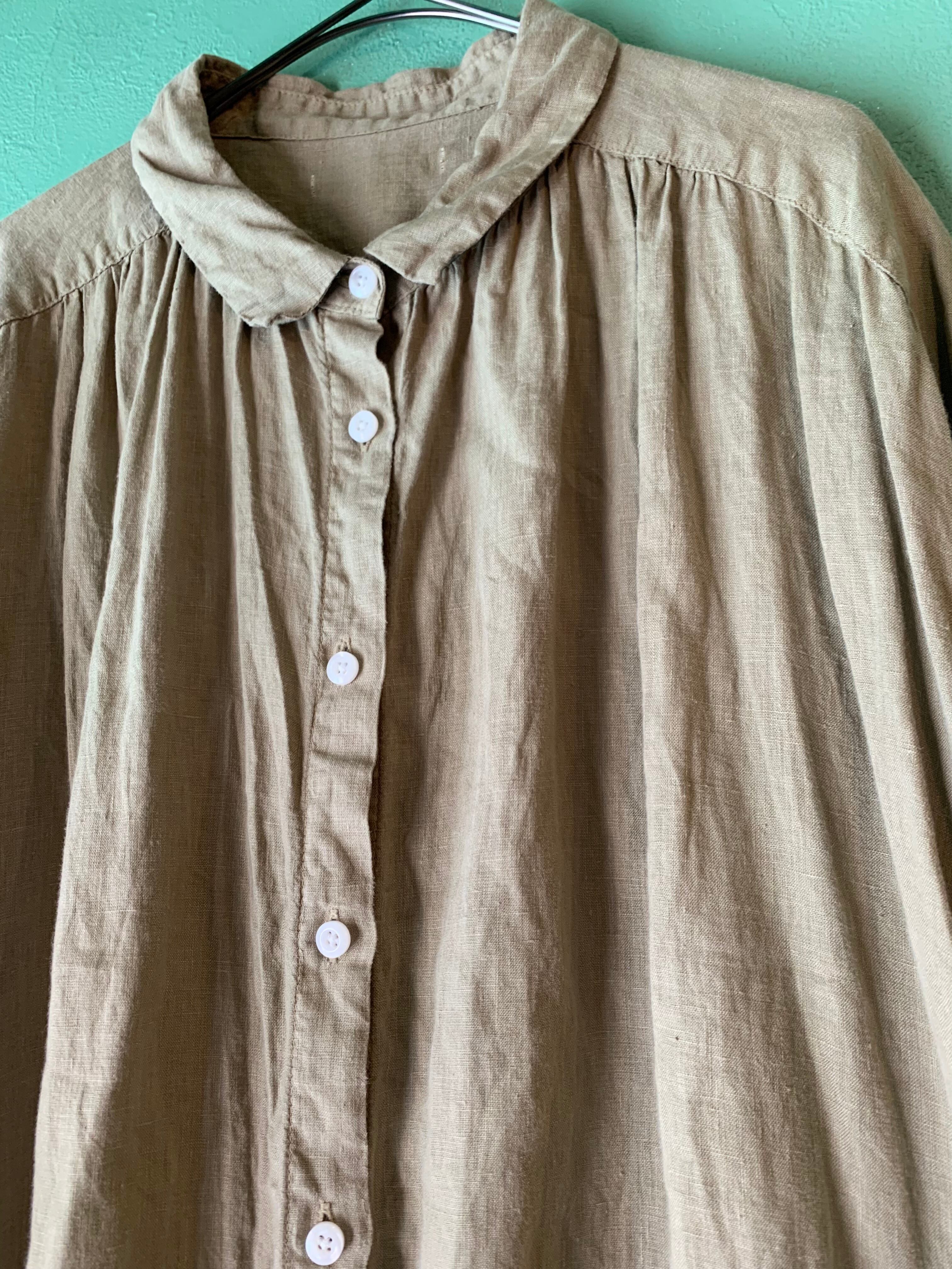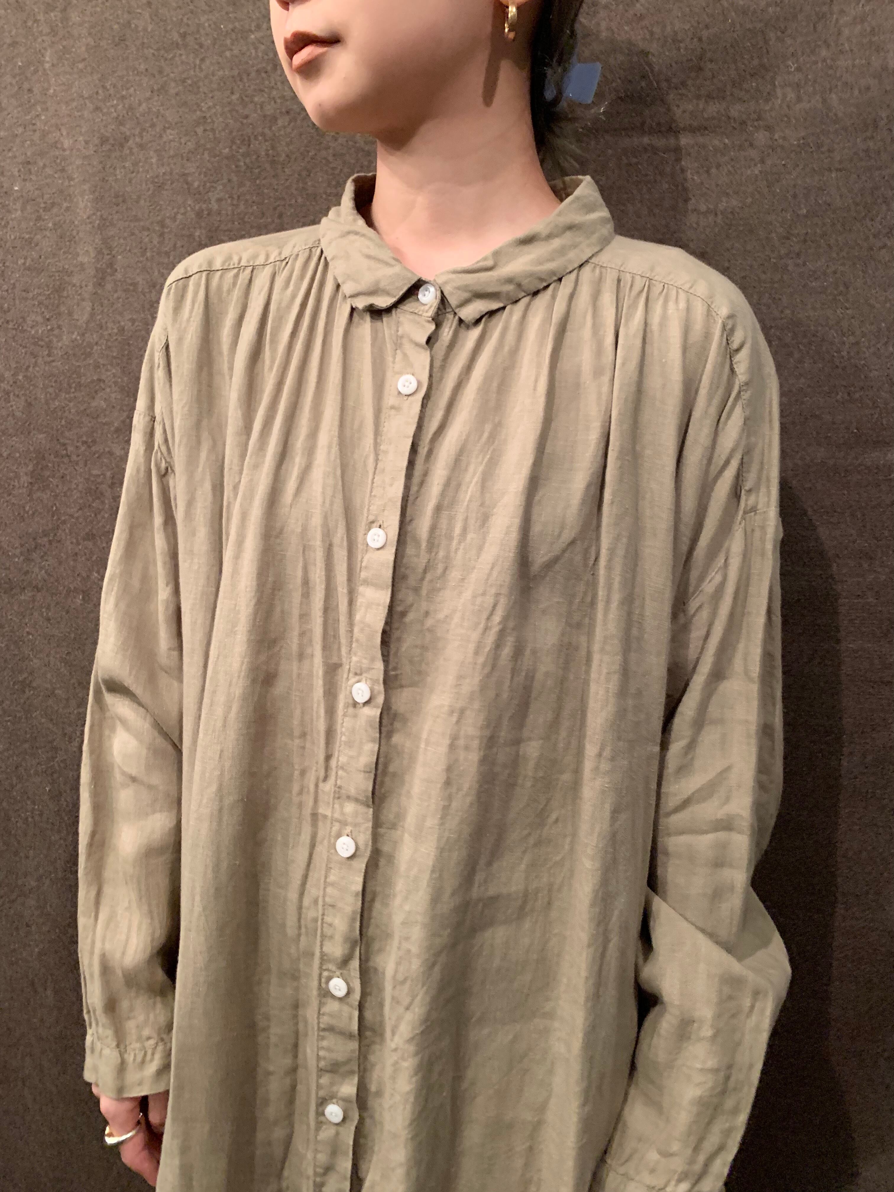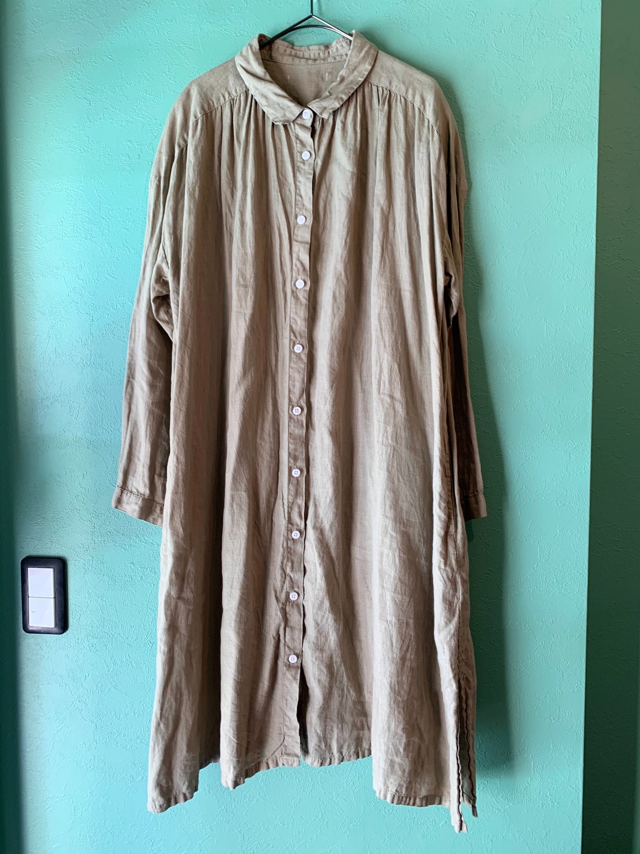 カーキベージュのようなマットなカラーに通気性の良いリネン素材のロングワンピース。