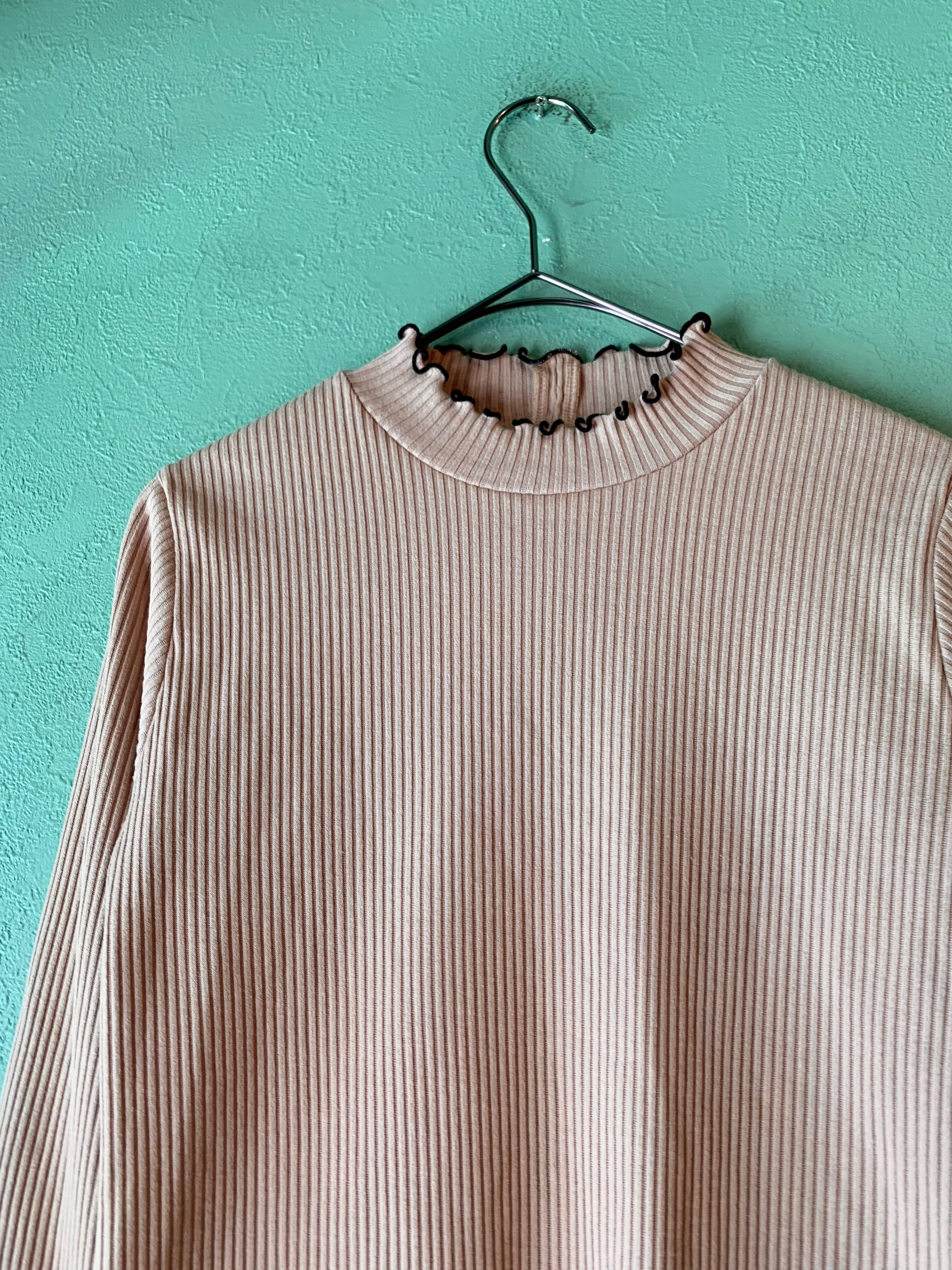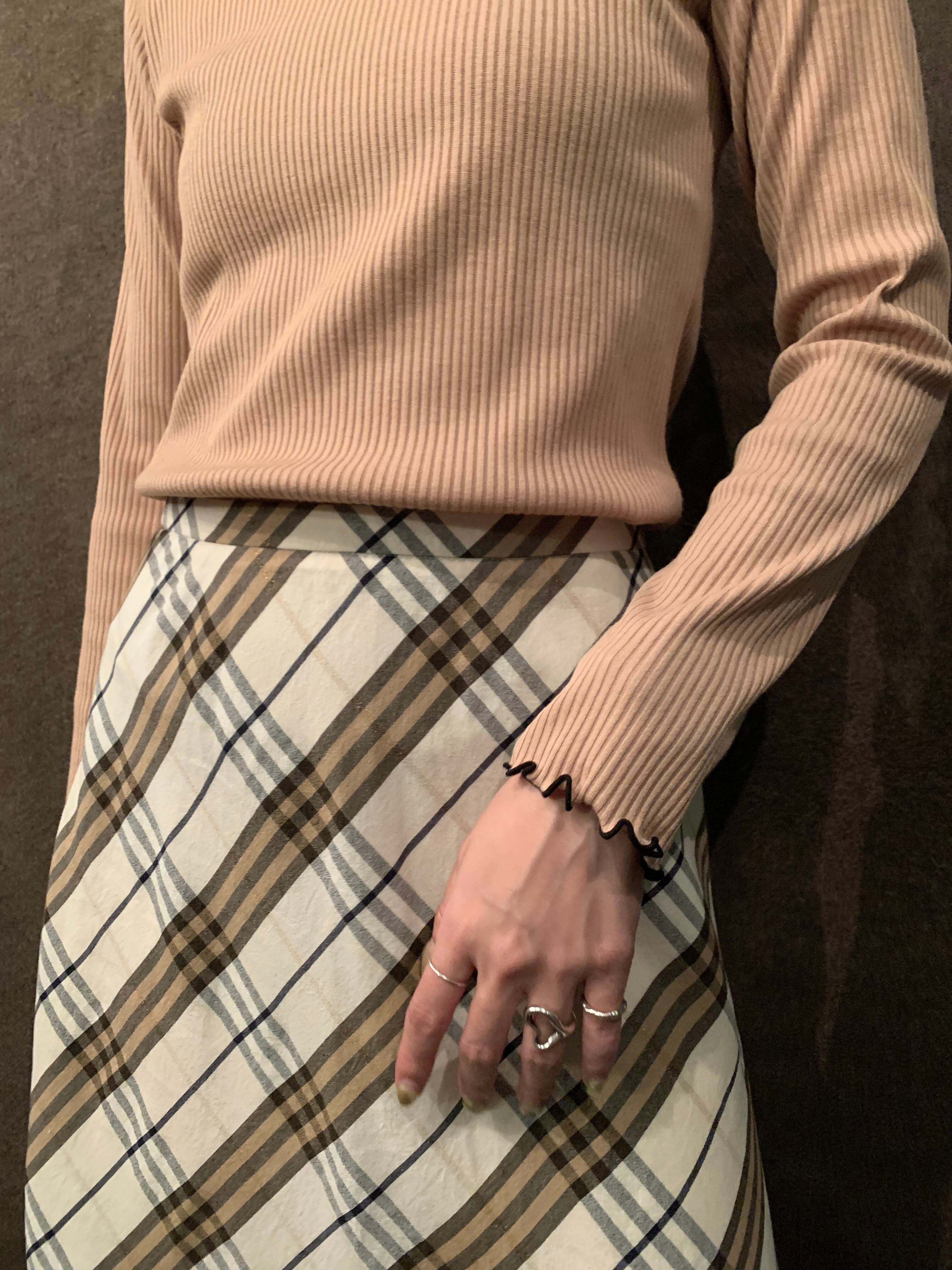ネックと裾にヒラヒラとパイピングデザインが可愛い一着。一枚でももちろん、インナー使いとしても着れる万能なニットソーです。