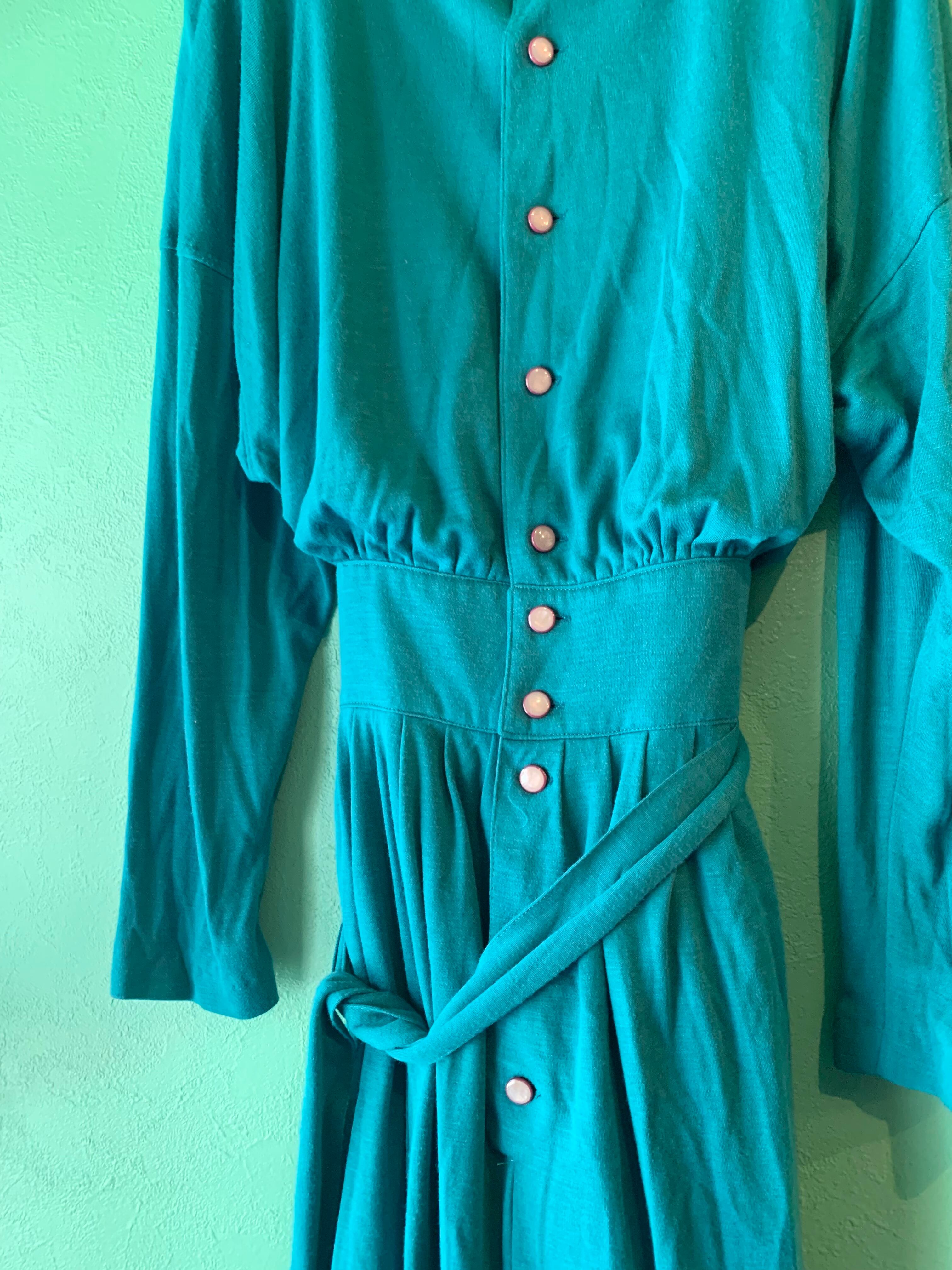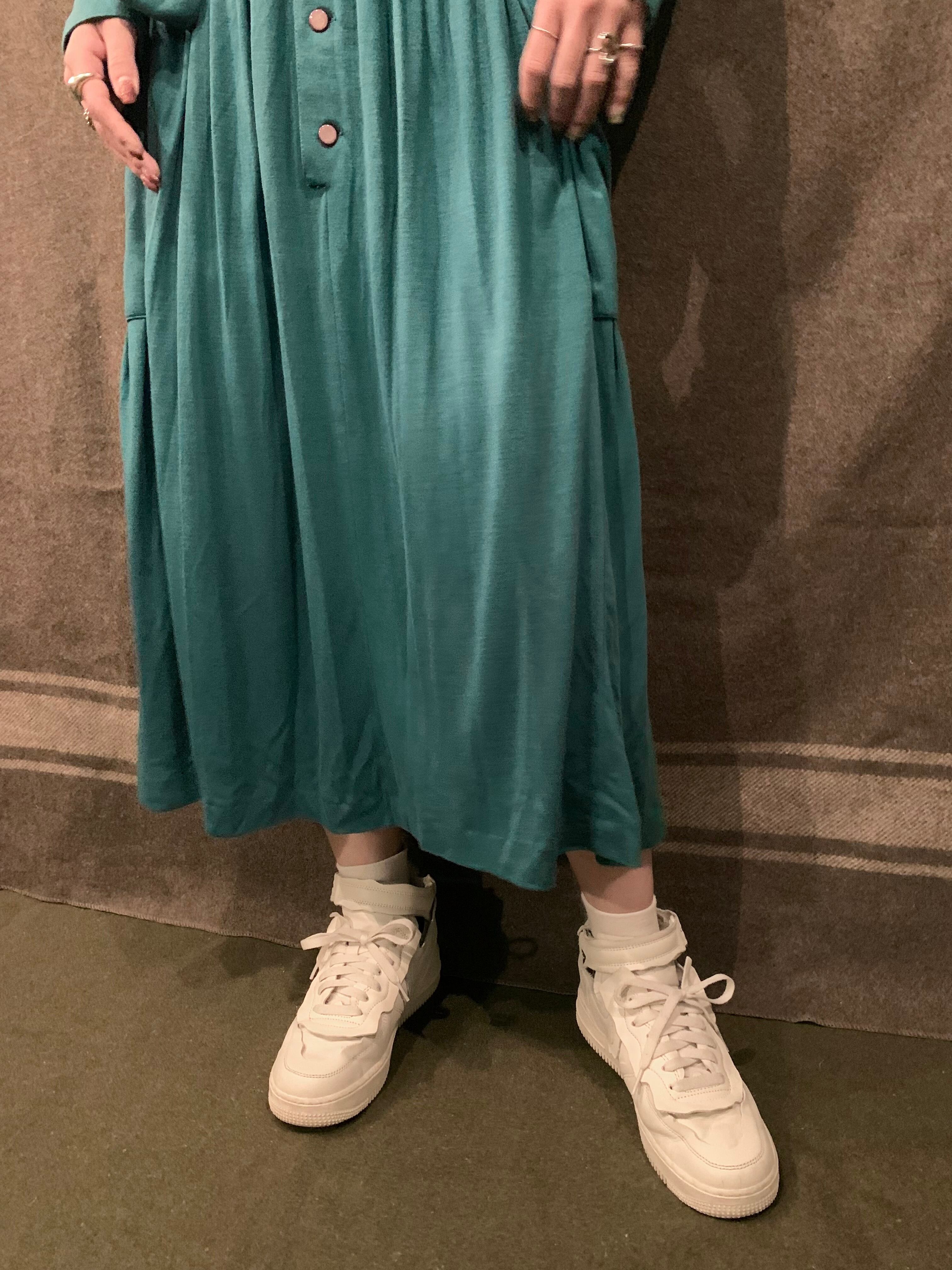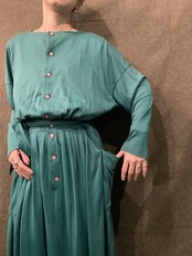 無地でシンプルながらも可愛らしいターコイズブルーカラーにアクセントとなるボタン、ドロップショルダー、ドレープしたスカート部分といった豊富なデザイン性。