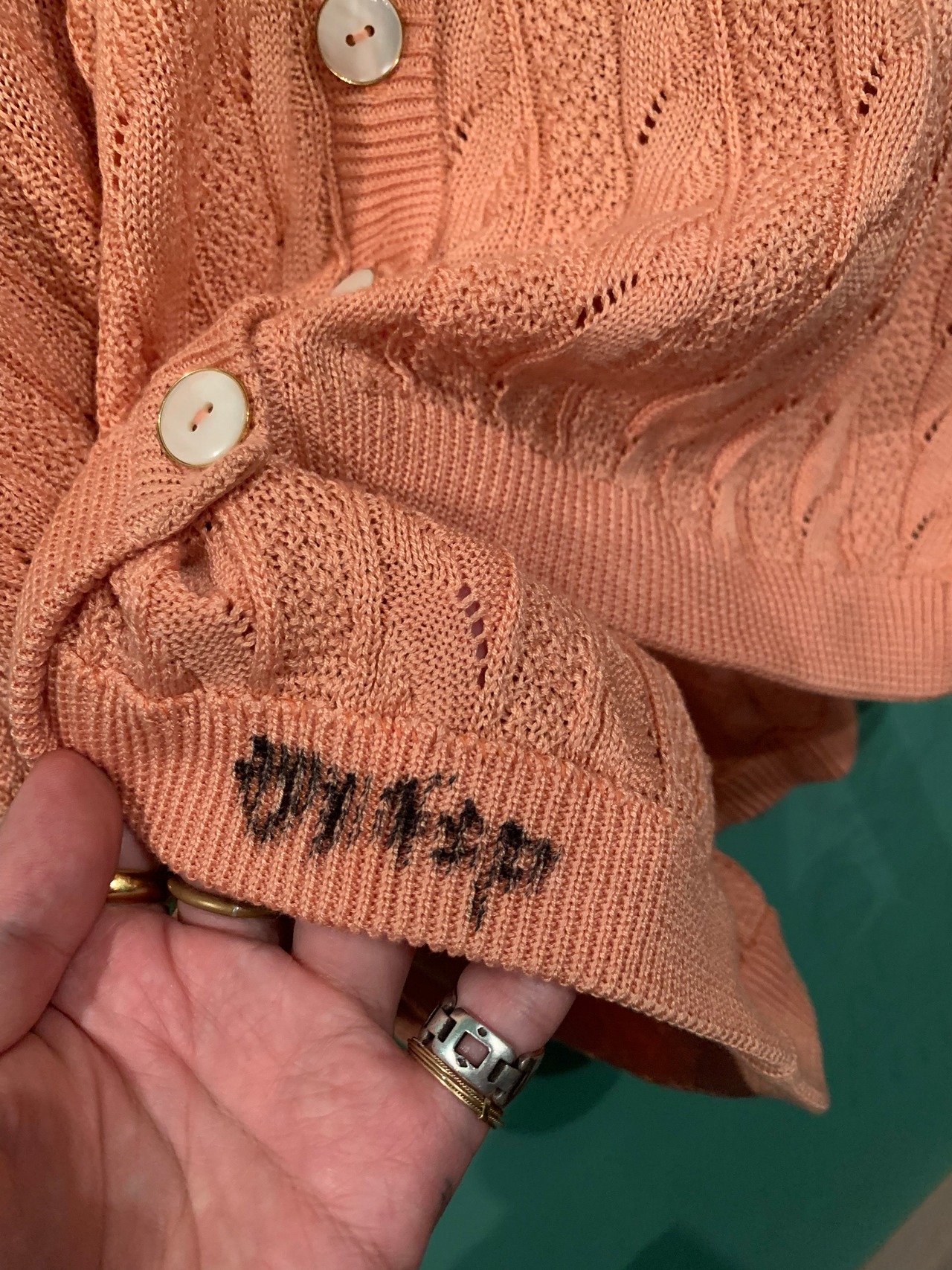 こちらは淡いピンクとオレンジの中間色のような可愛らしい色味にケーブル編みデザインのカーディガン。