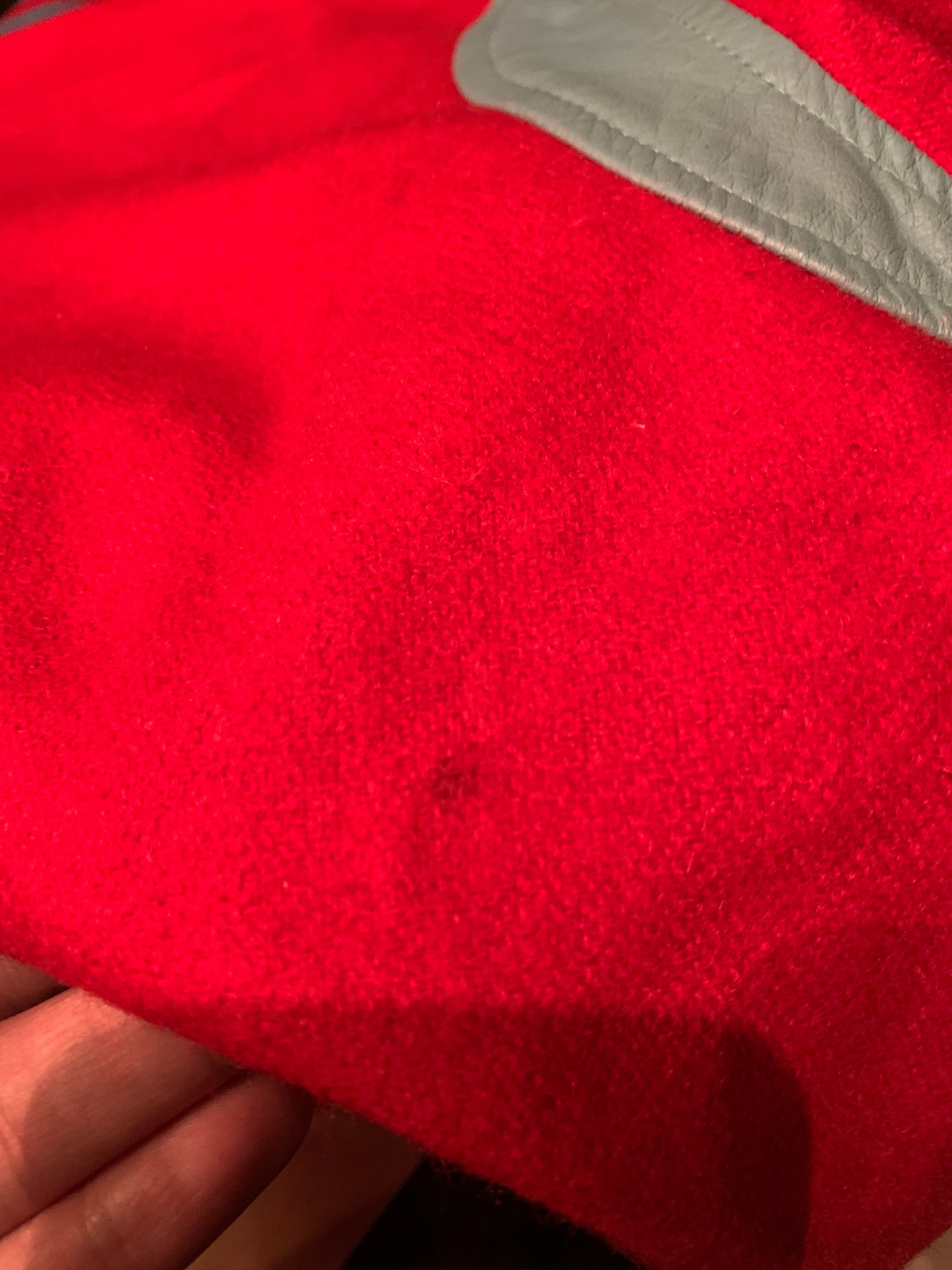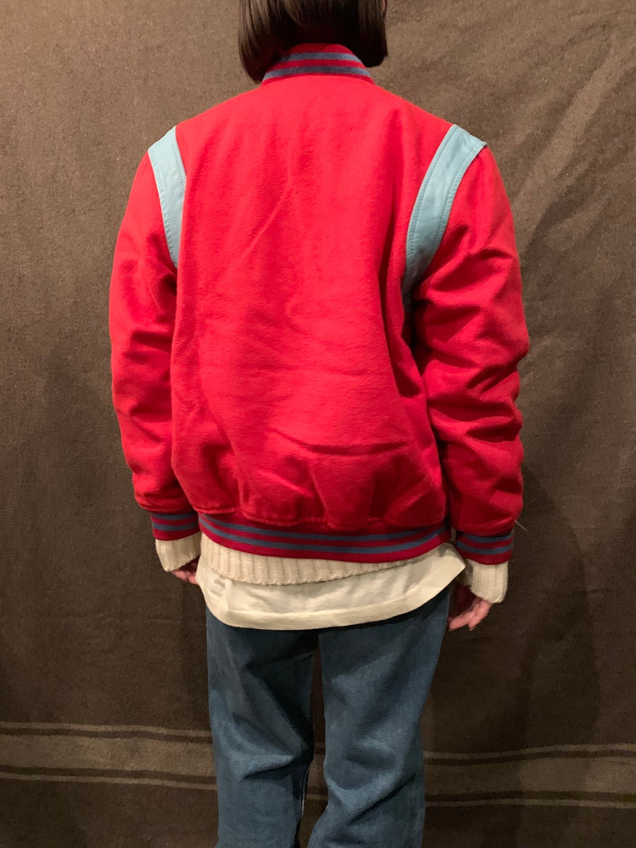 レッドカラーをベースにリブのラインと腕の付け根部分が水色の切り替えになったヴィンテージらしい可愛らしいカラーリング。
