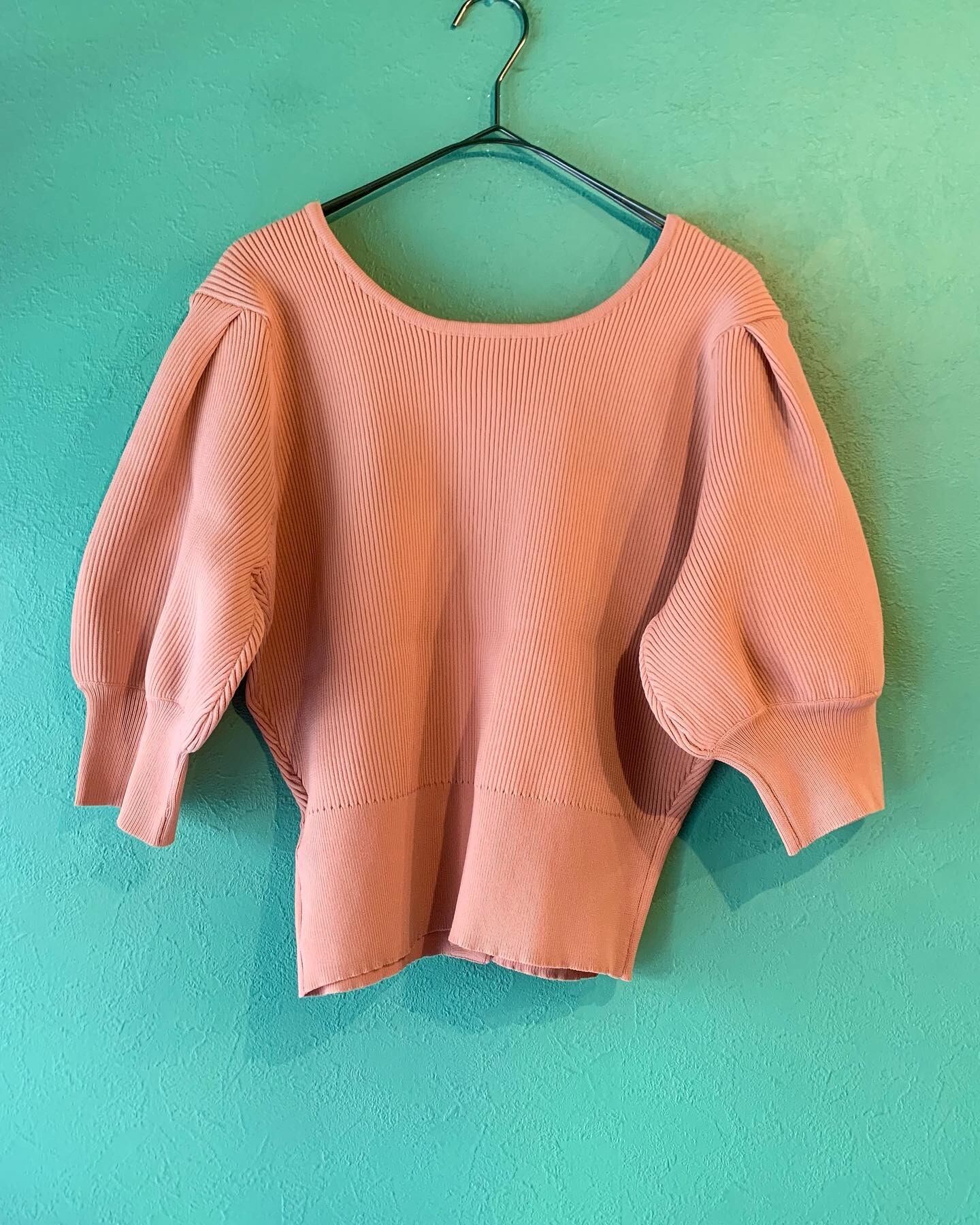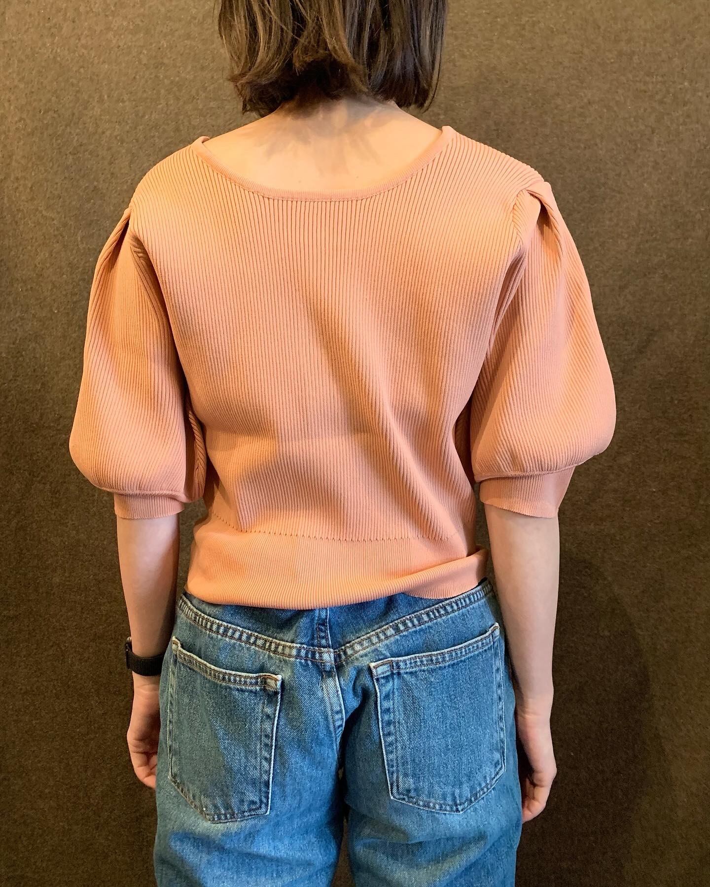 いやらしくない、程よいデコルテの出たスクエアネックに袖元にボリュームの出るパフスリーブデザイン。