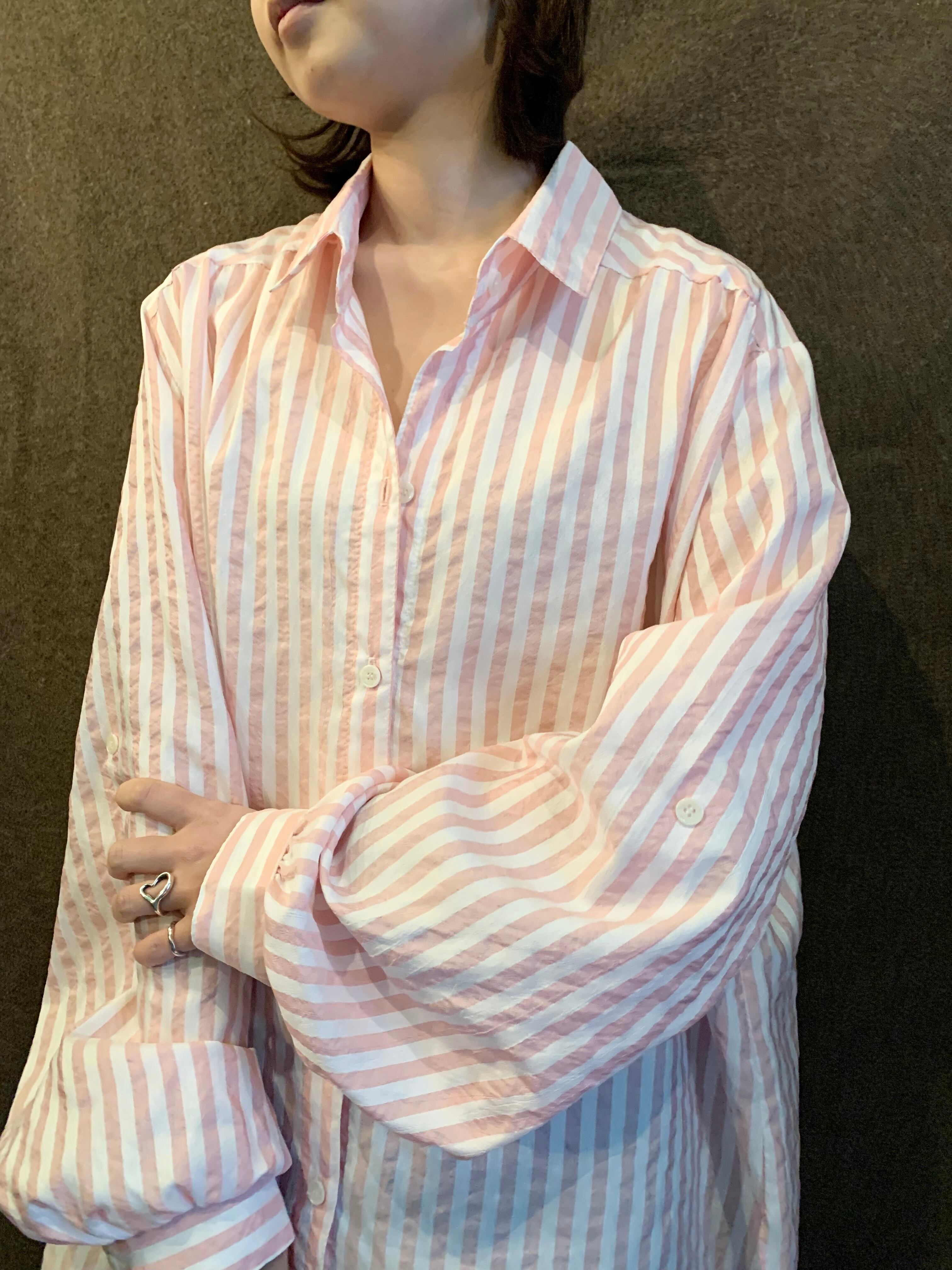ポリエステル特有の光沢のある生地にオーバーサイズ、クシャっとしたシワ加工のバランス感のおもしろいアイテム。