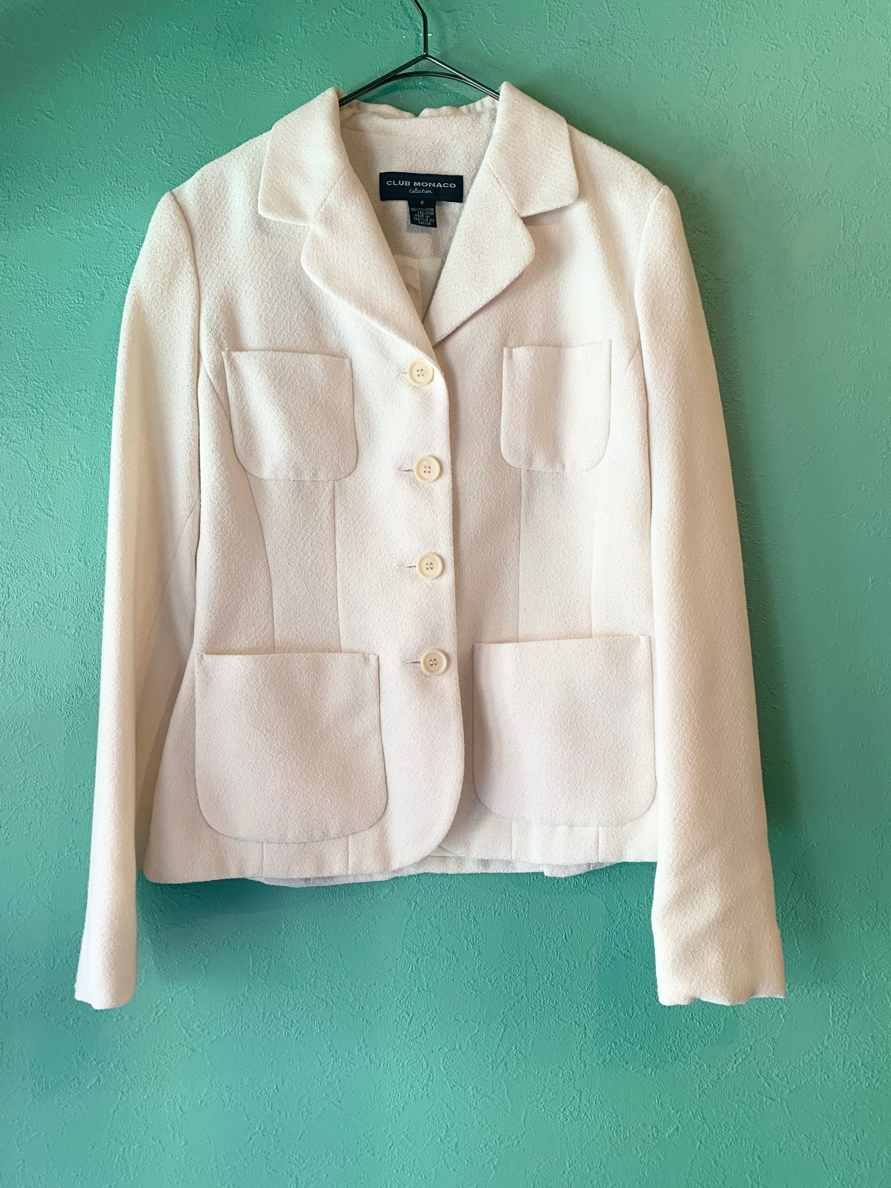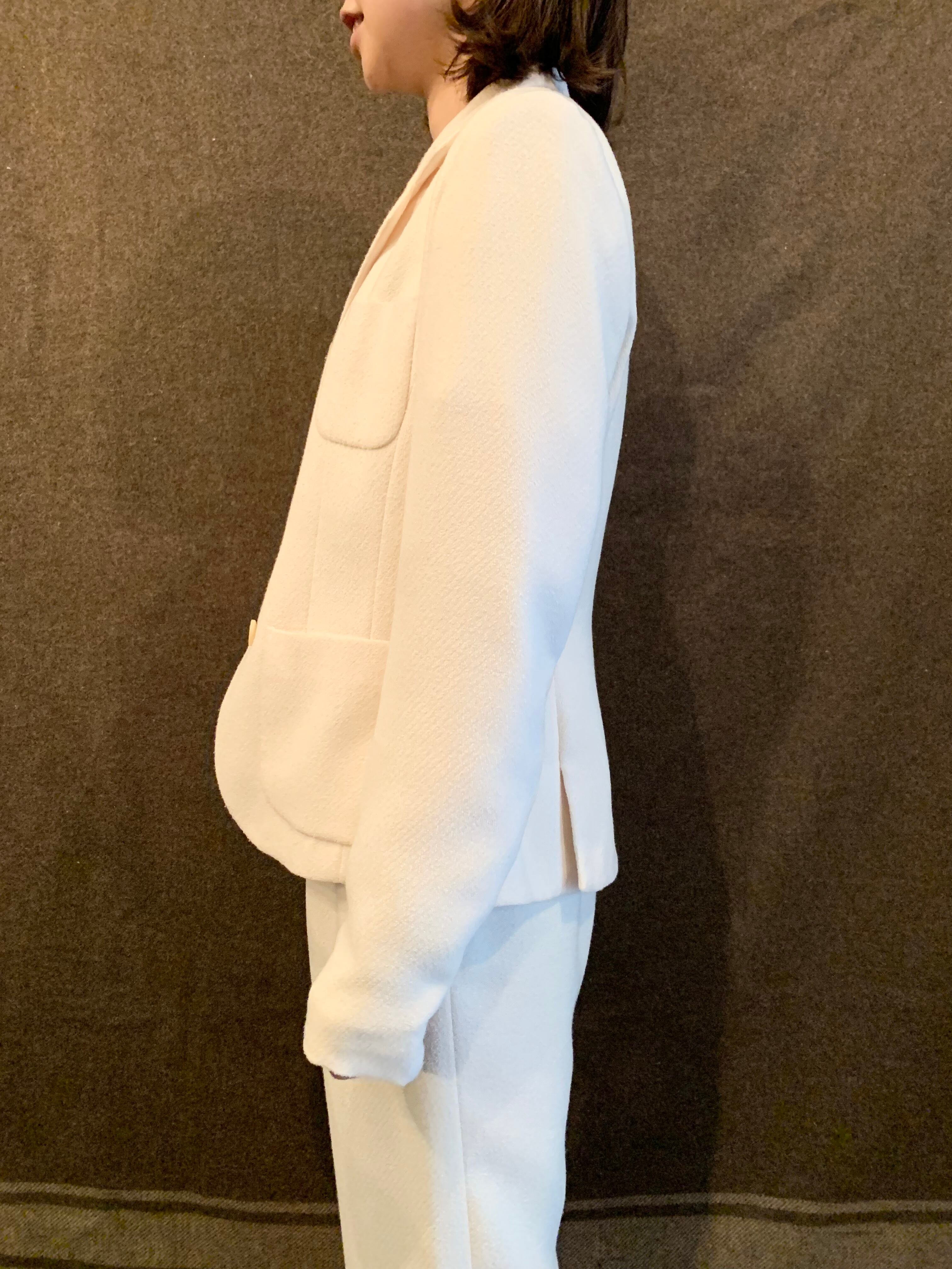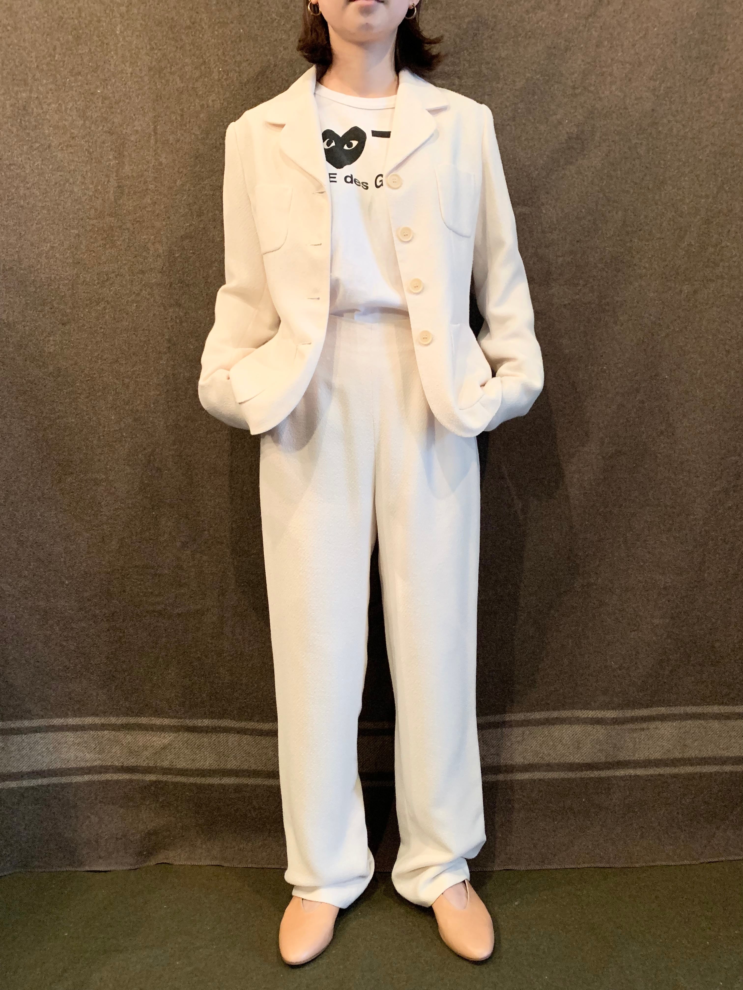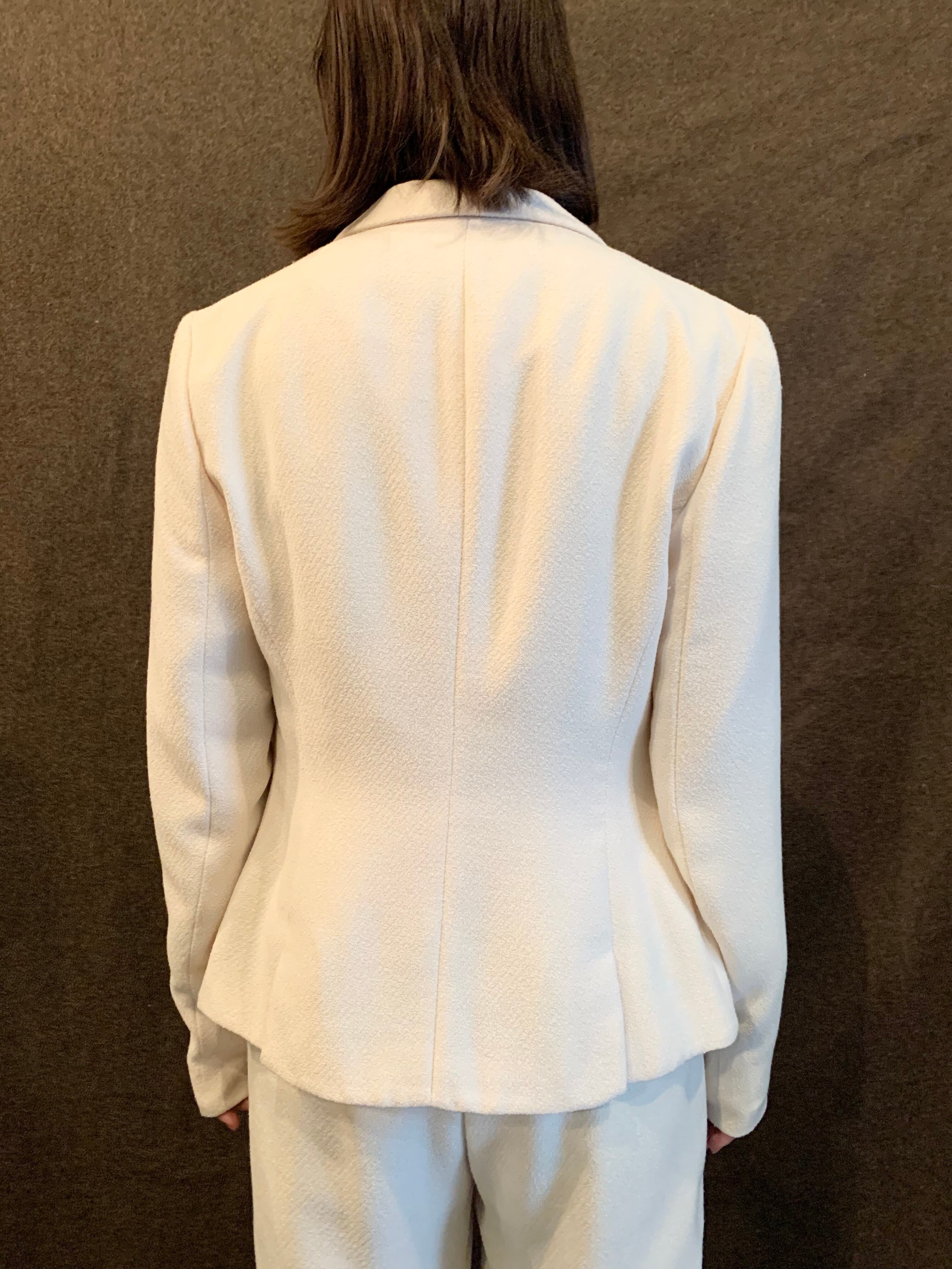 シンプルなホワイトカラーのジャケットとパンツのセットアップ。