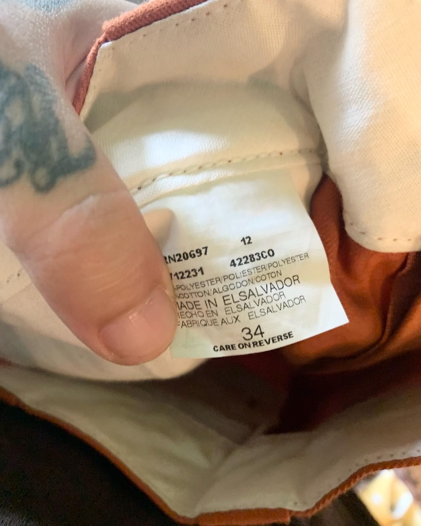 おそらくUS規格のカラーリングで膝丈くらいまであるワイドシルエットです。