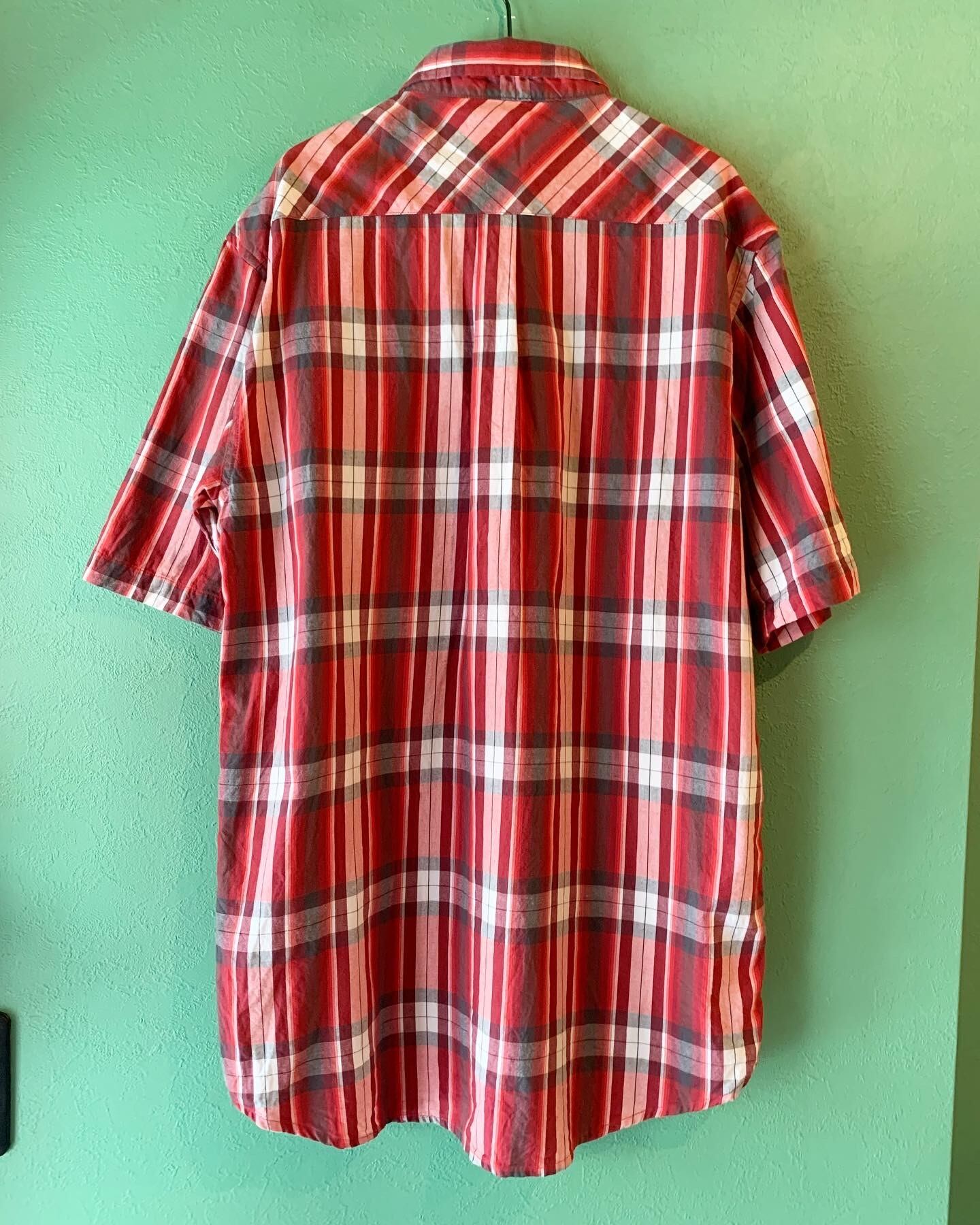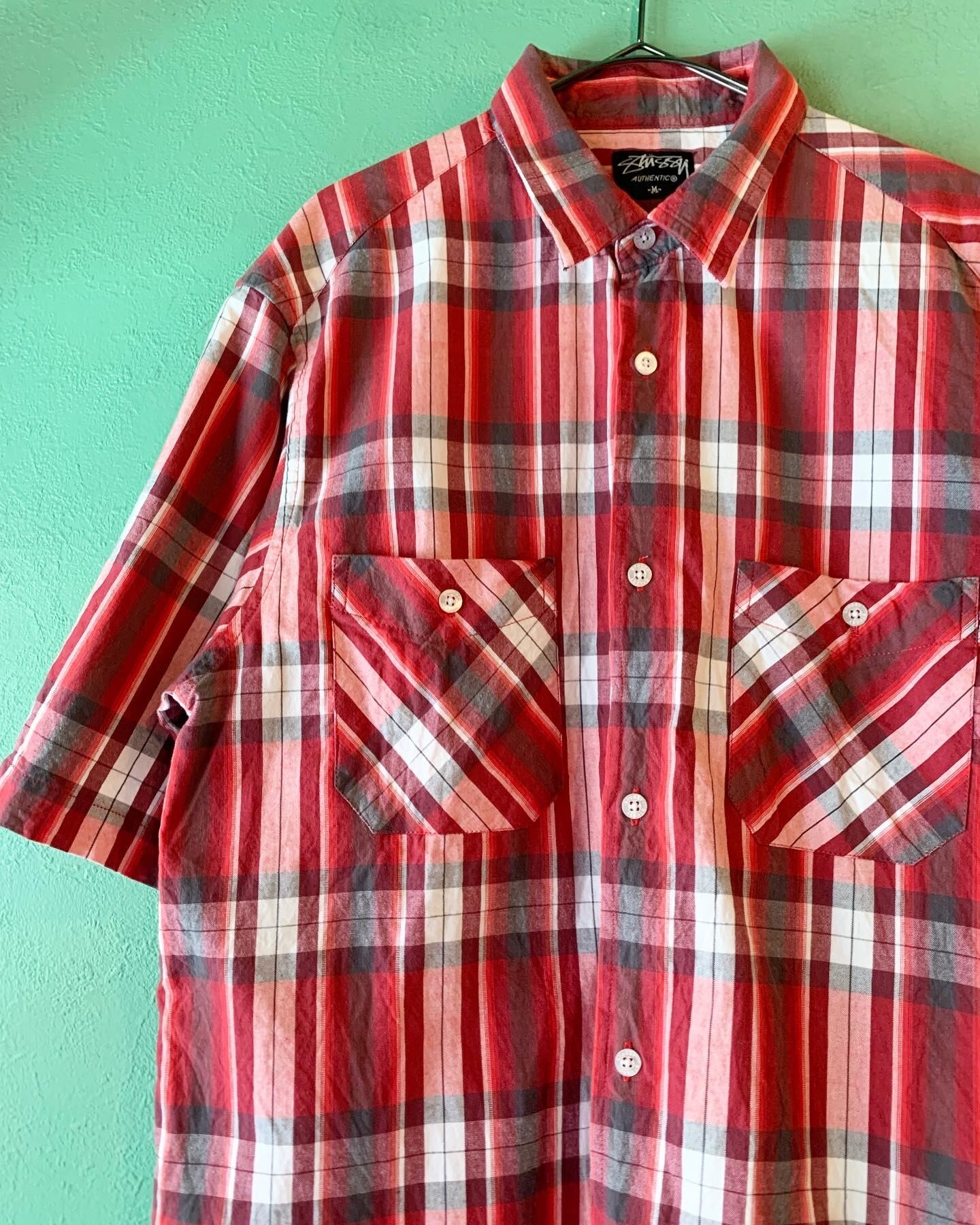 こちらはレッド×ホワイト×ブラックのクールなカラーリングのチェックパターンシャツ。