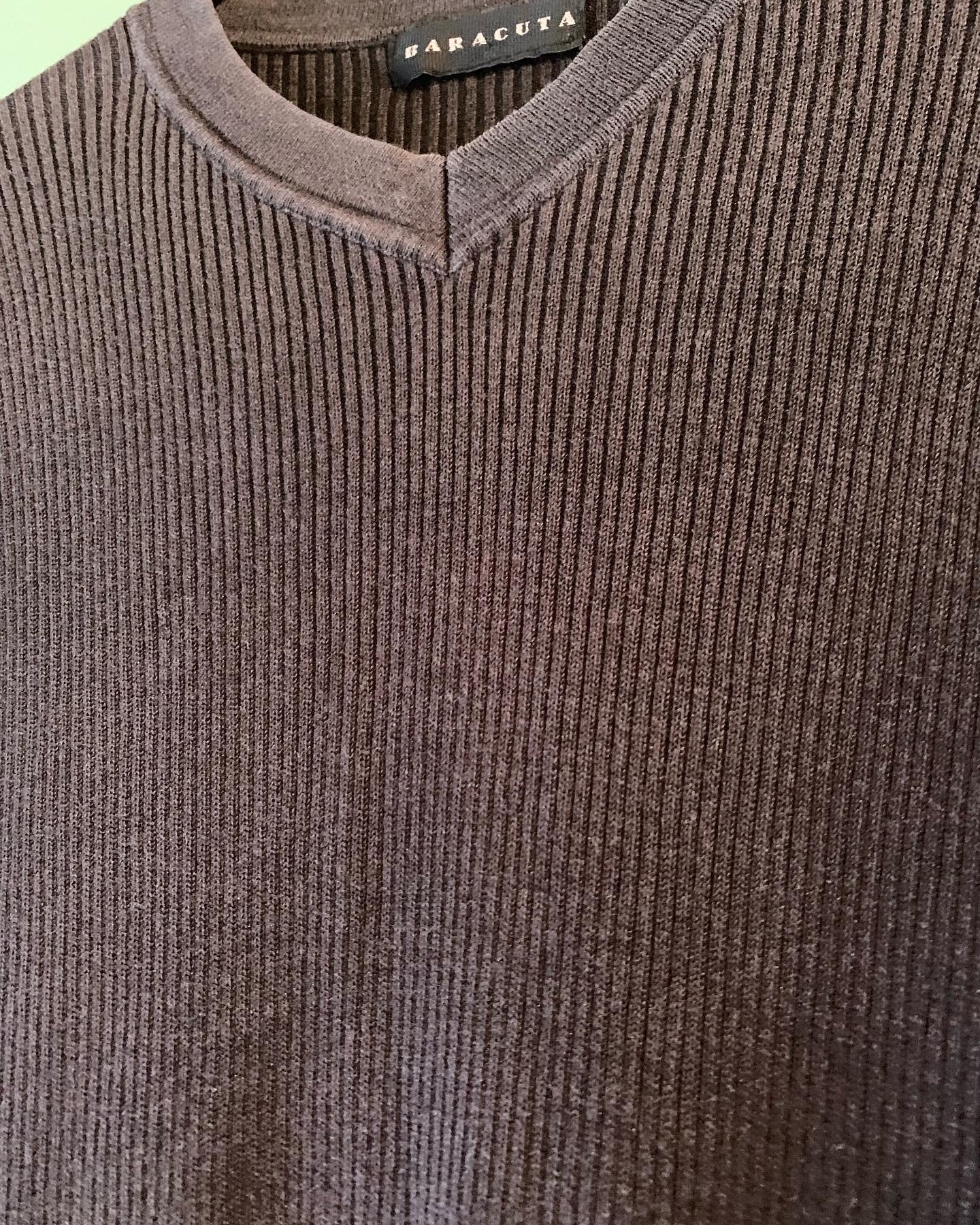 シンプルなブラックカラーにリブ編みのTシャツ。