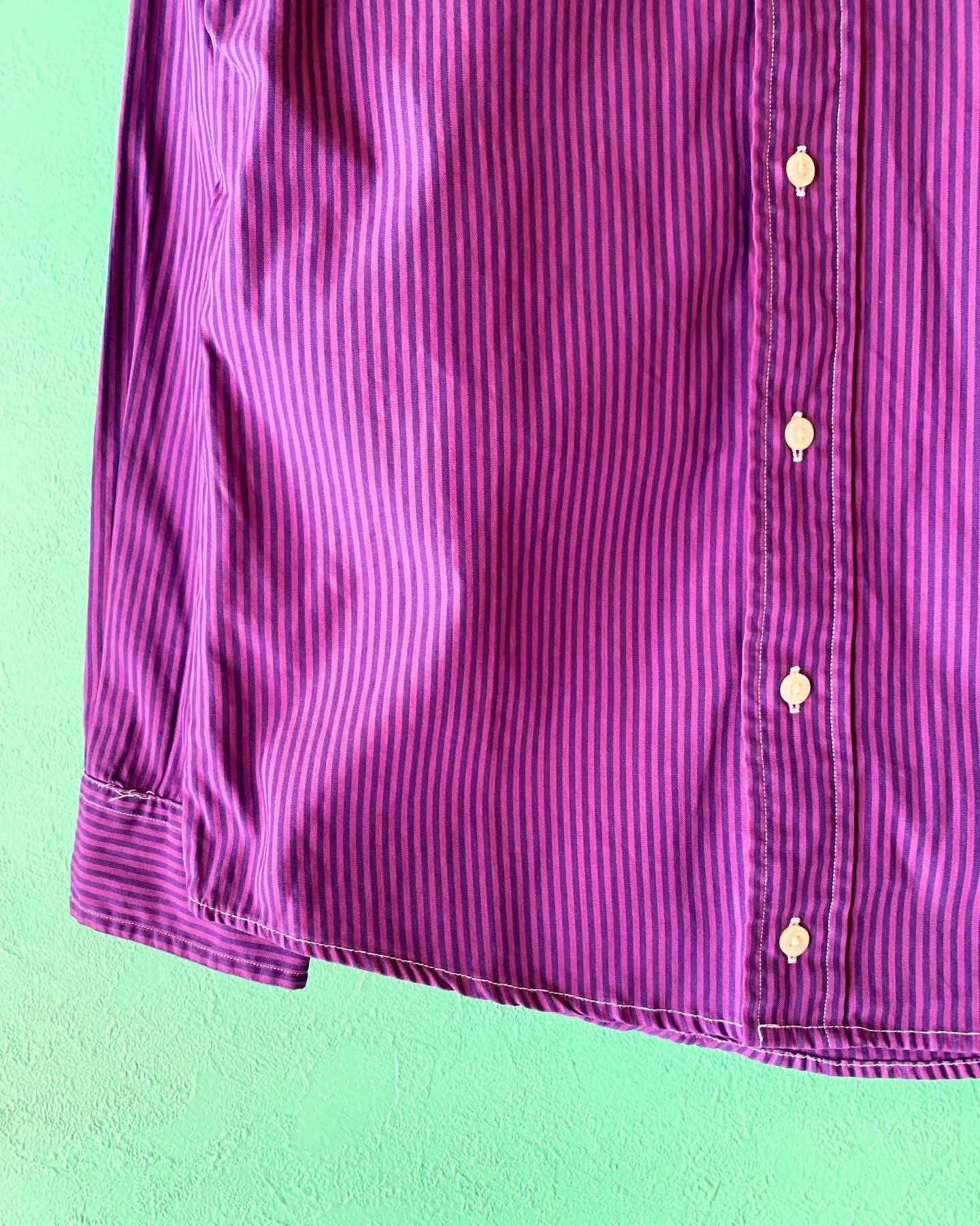 妖艶なパープル×ピンクパープルの細ピッチストライプパターン。ステッチまで白い糸を使用した玄人ウケの良い1着。
