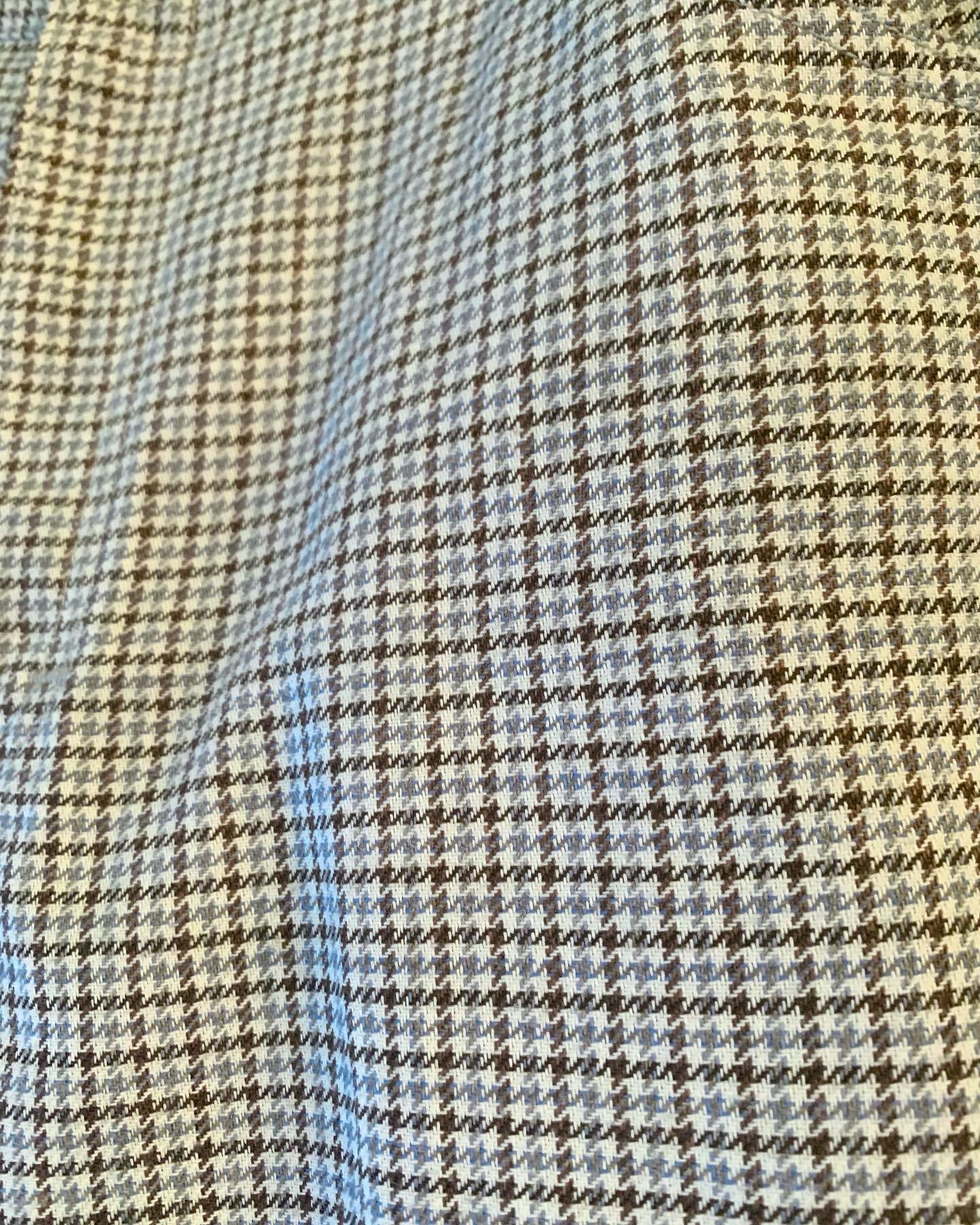 こちらはグレー×ダークブラウンの千鳥格子柄パンツ。よく見るとグレーの周りに水色のステッチワークが施された可愛いカラーリング。