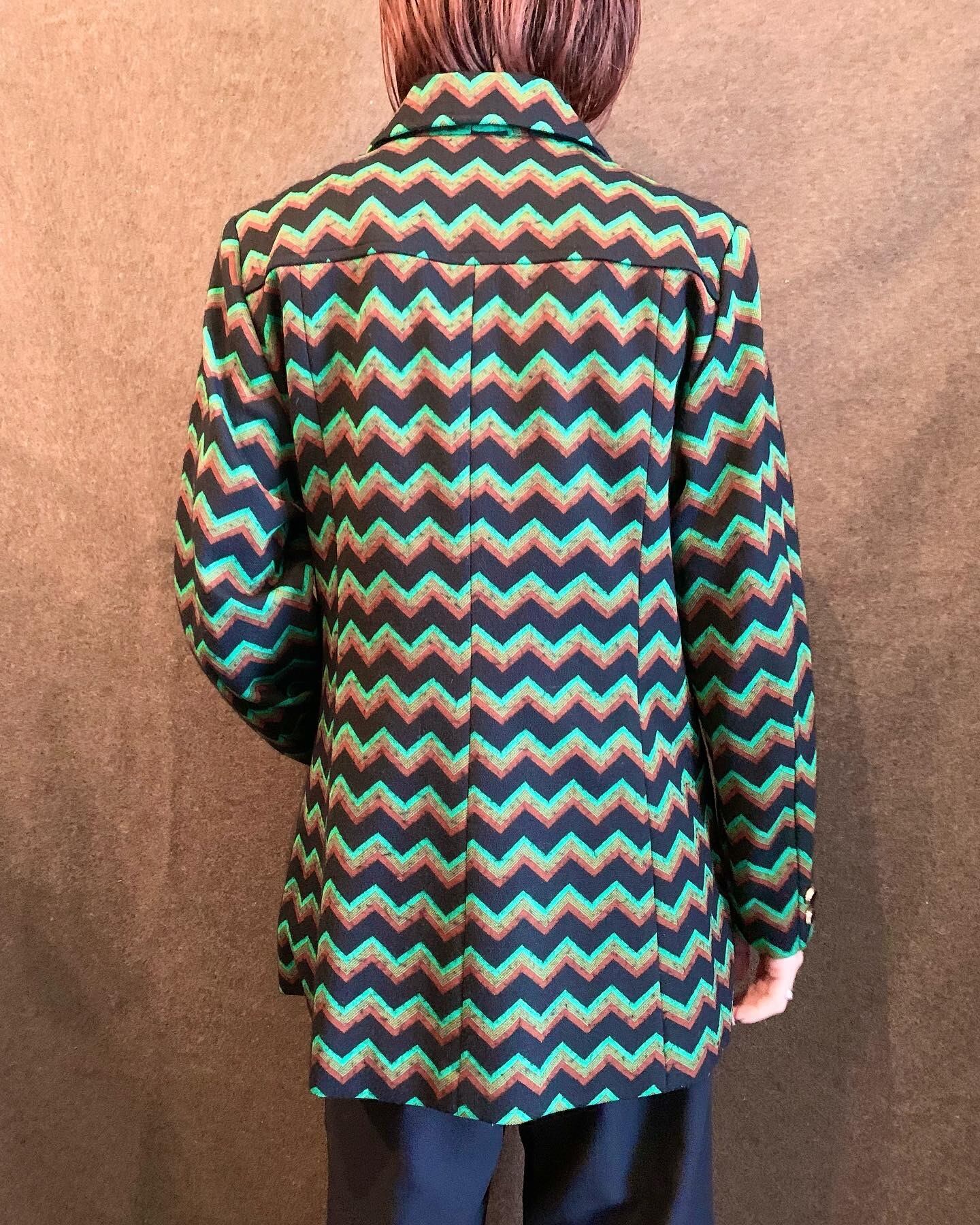 ブラックをベースとしたグリーン×レンガブラウンのギザギザ模様がインパクトのあるジャケット。
