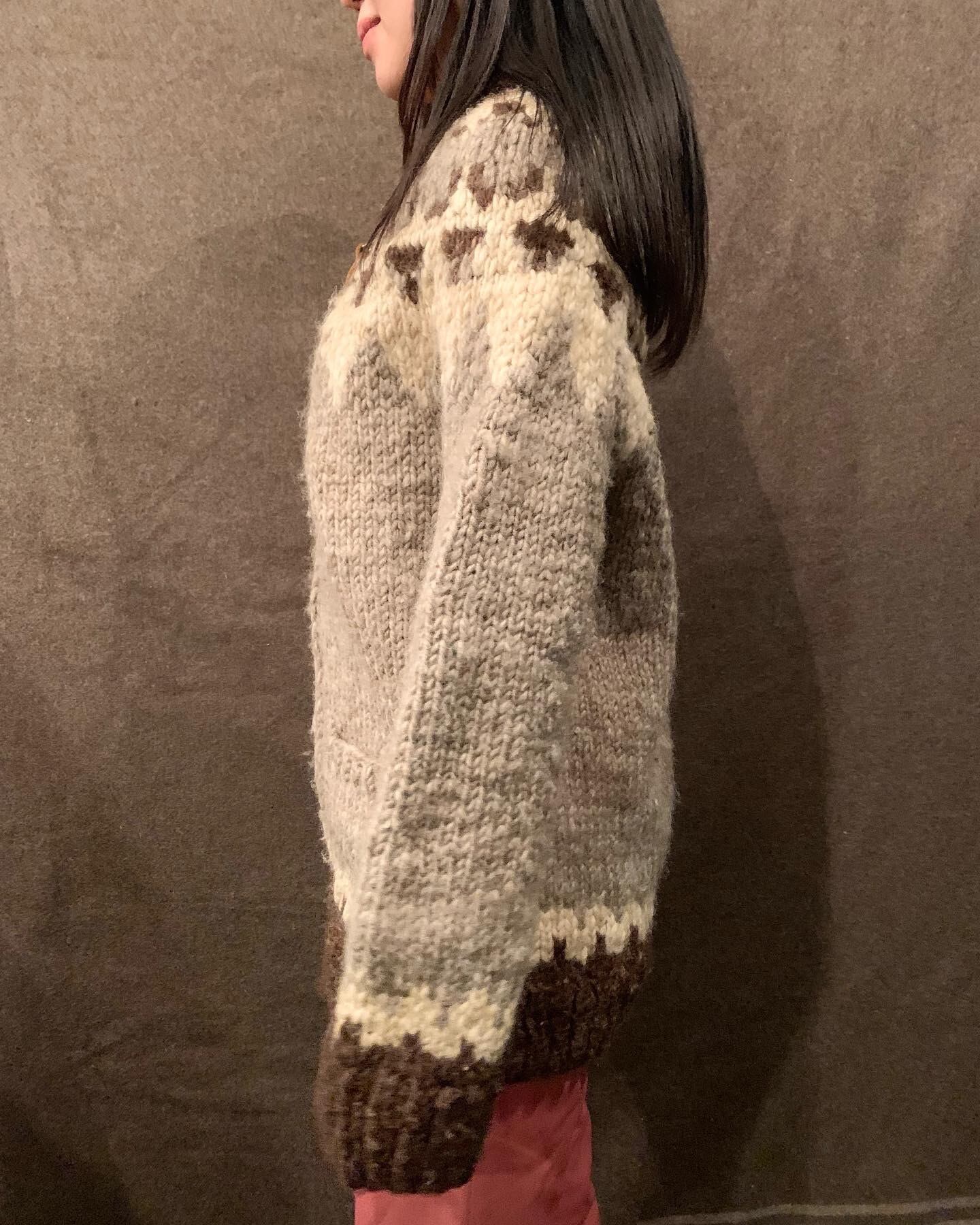 カナディアンセーターの特徴は、白やグレー系をベースにした、狩猟文化を反映した自然に関する文様や動物のモチーフや幾何学的なデザインでカウチンセーターは、機械生産ではなく、今でもハンドメイドで作られていることから生産数も限られています。